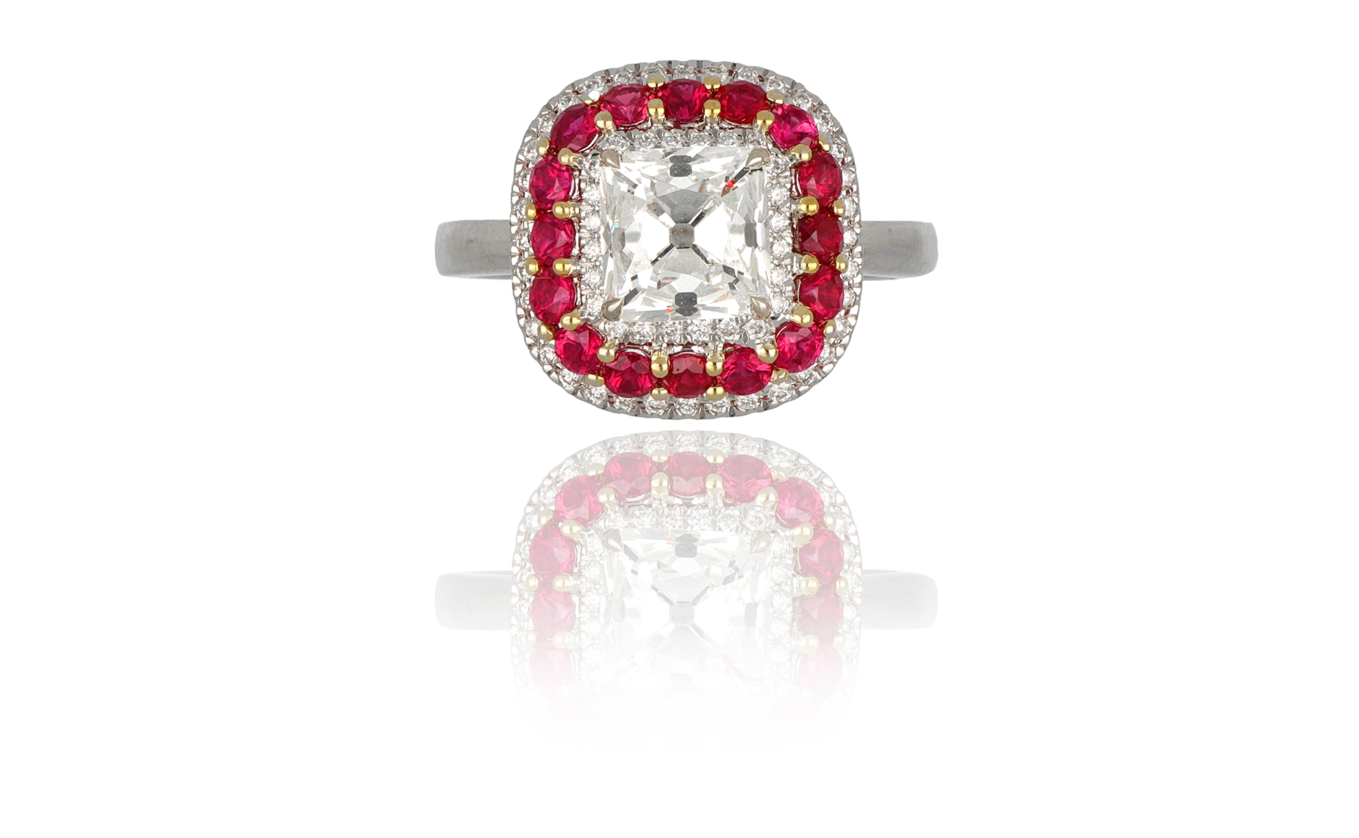 Stiloso anello in oro bianco al centro un raro diamante taglio francese di stimati ct. 2 0 è contornato da vivaci rubini taglio rotondo e piccoli diamanti taglio brillante.