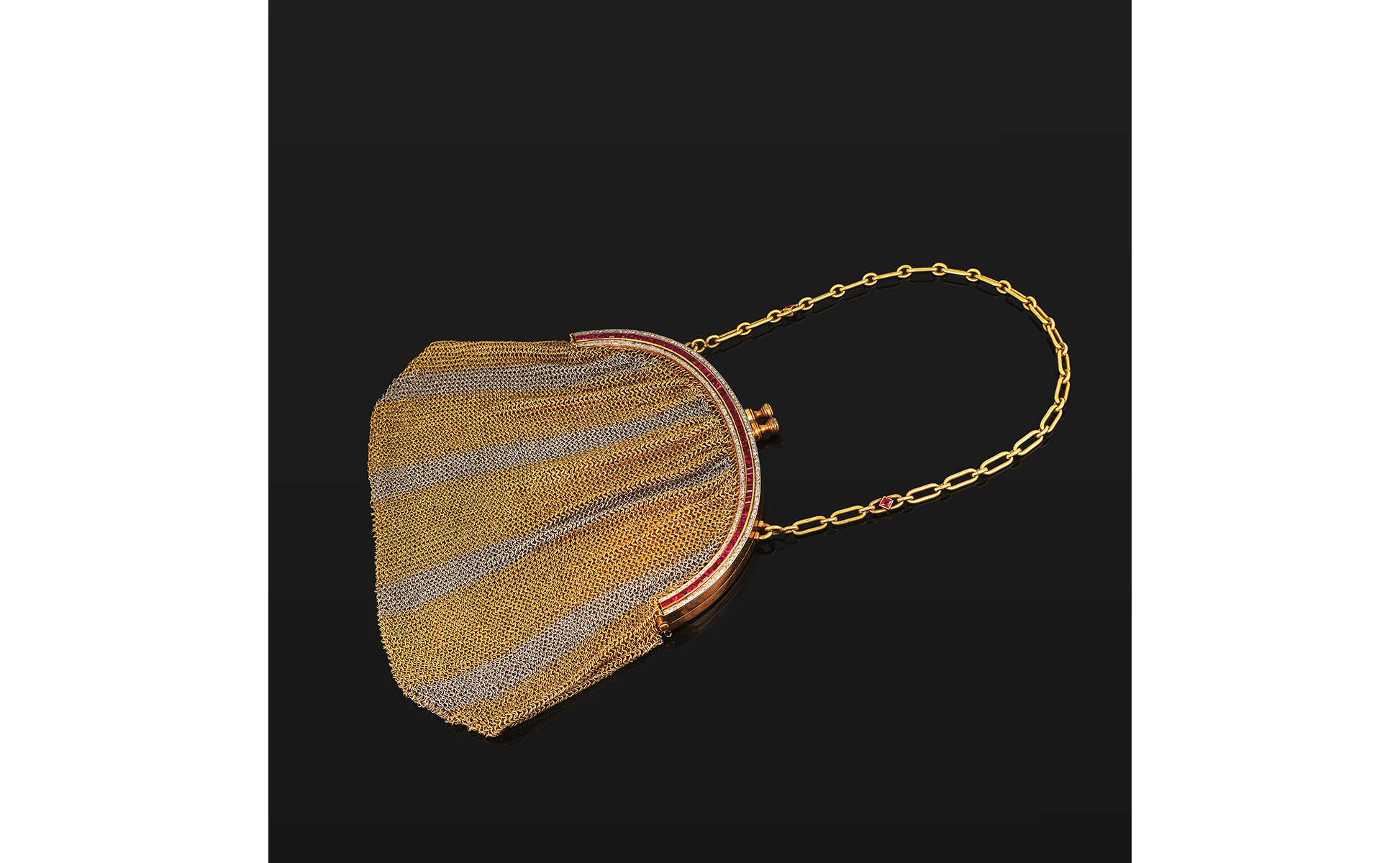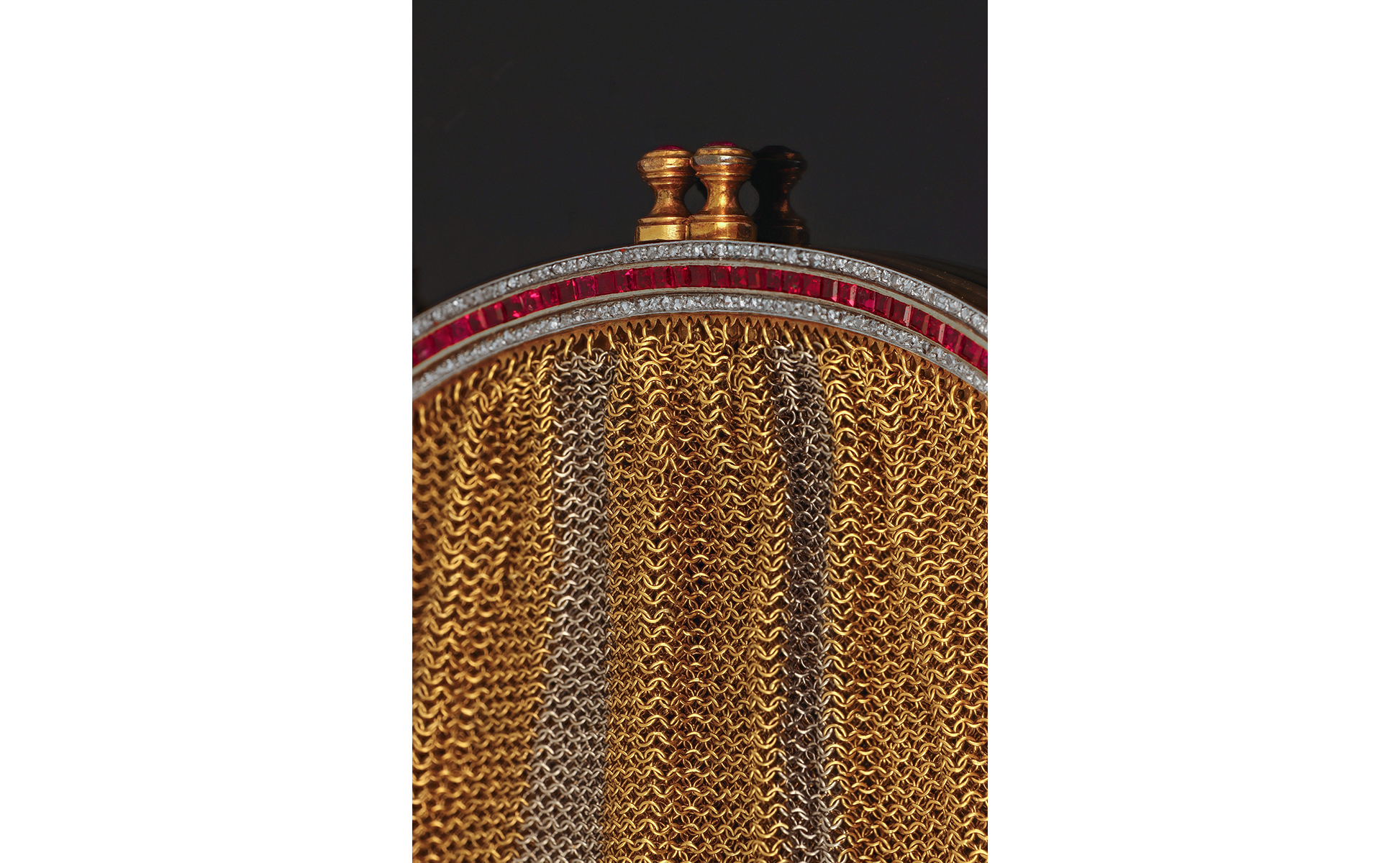 Antica 'reticule bag' finissima borsetta da sera in oro giallo e platino punzoni francesi e del maker di epoca primi '900 sull' arco di chiusura una fila di luminosi rubini birmani taglio carre' sono affiancati da due file di diamanti taglio rosa.