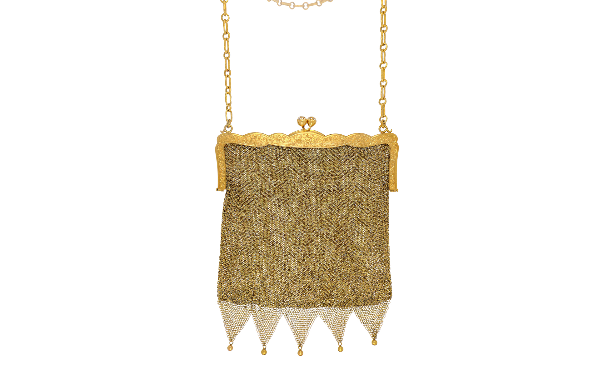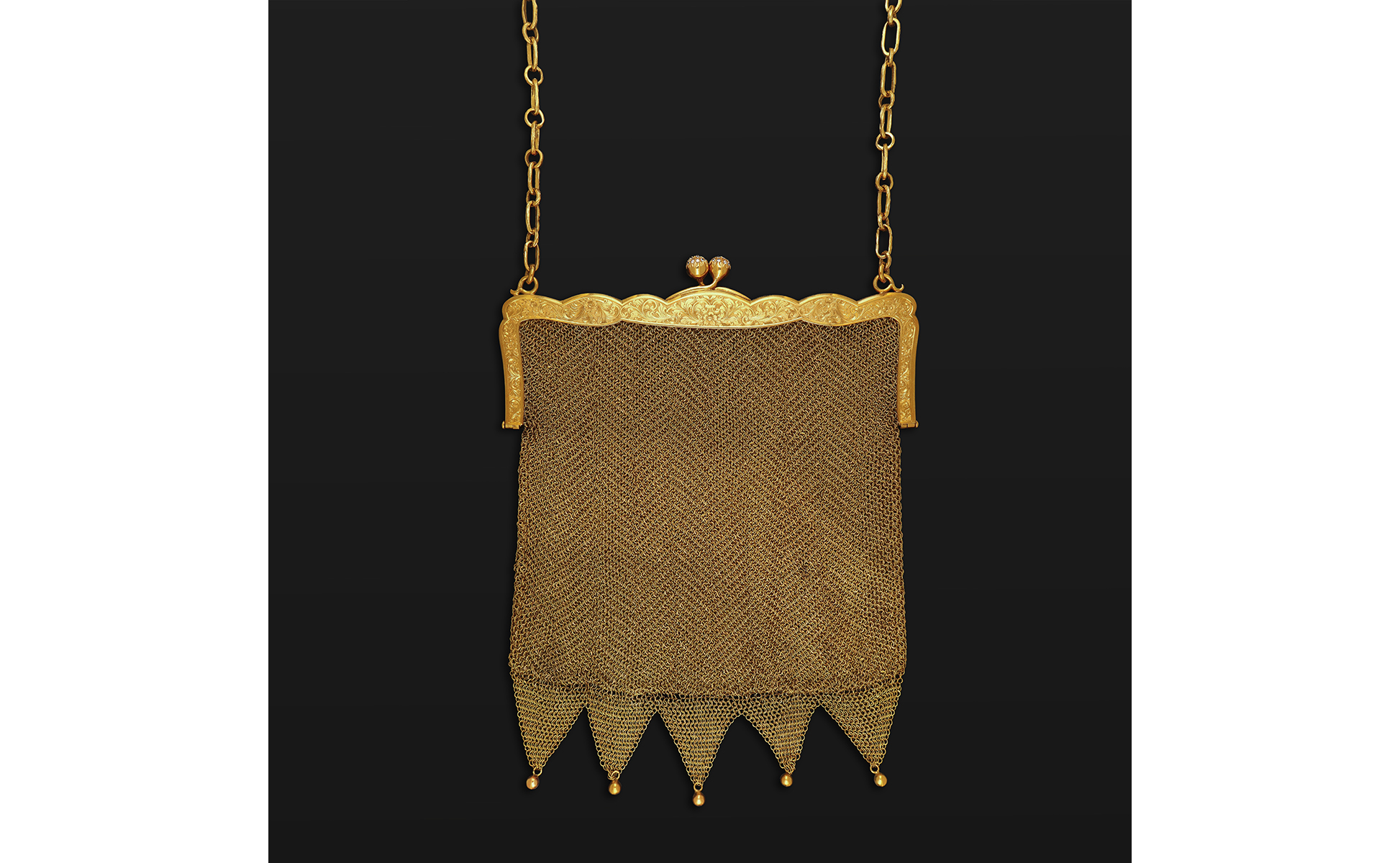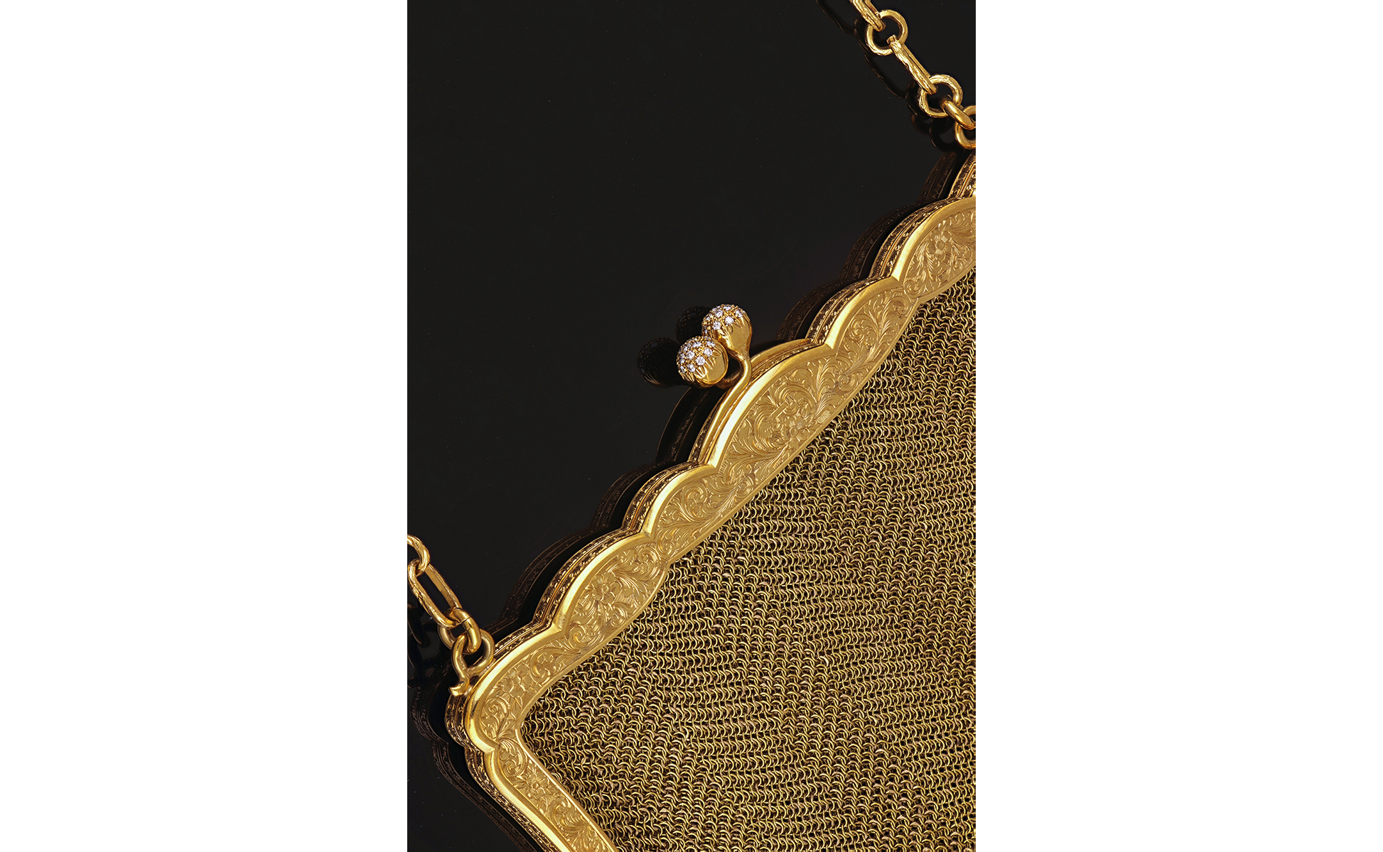 Fine borsetta da sera 'reticule bag' realizzata in oro giallo con incisioni floreali e a ramage sulle arcate di chiusura i due bottoni sono adornati con piccoli diamanti taglio brillante la catena martellata completa il gioiello.