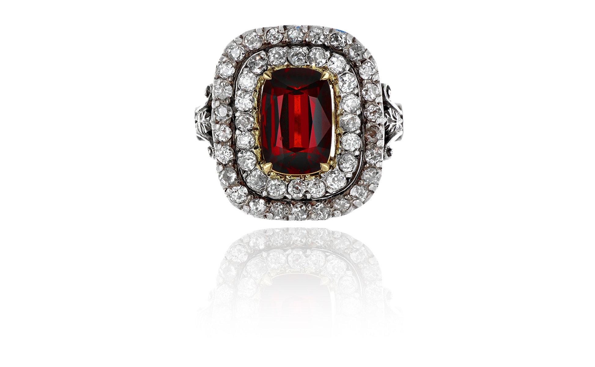 Anello d'epoca tardo vittoriana in oro giallo e argento con doppio contorno di diamanti taglio antico al centro bellissimo spinello rosso di 2 95 ct di forma a cuscino accompagnato da report gemmologico del Gemmological Institute of America GIA che ne attesta l'origine Birmana e l'assenza di trattamento termico.