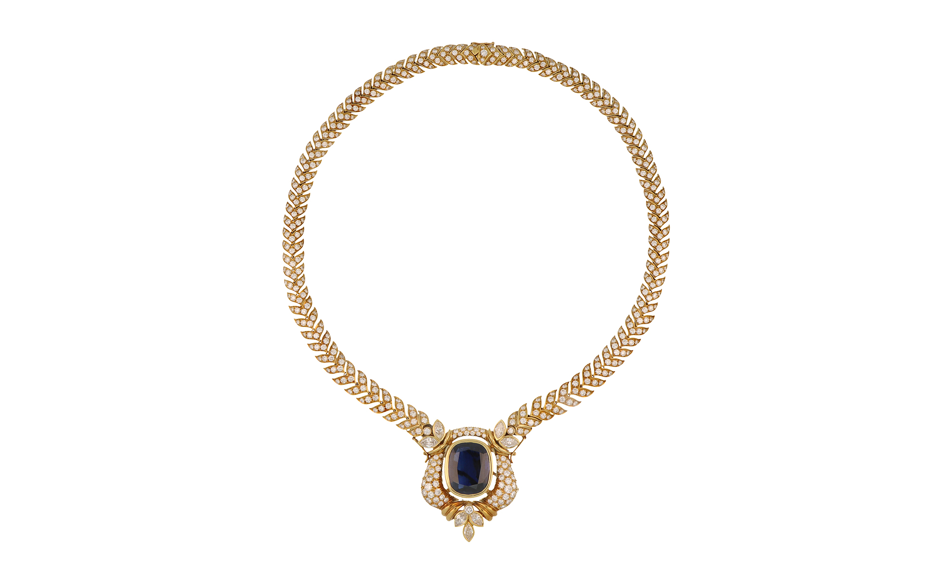 Importante girocollo in oro giallo realizzato con lavorazione a spina di pesce interamente tempestato di diamanti taglio brillante per ct. 18 0 ca. al centro grande zaffiro taglio cuscino non riscaldato di ct. 18 0 ca.