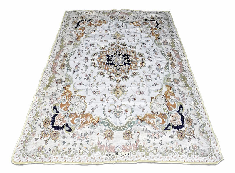 TAPPETO KILIM IN SETA fondo color avorio, campo con medaglione centrale e motivi floreali nei toni del verde, nero e beige, firmato cm 208x152 SILK KILIM RUG