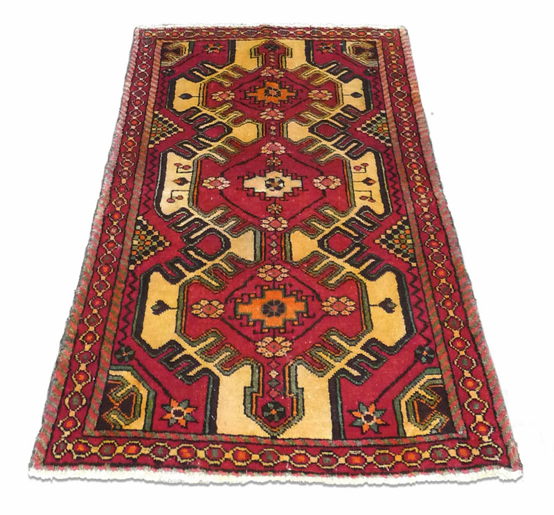 TAPPETO PERSIANO HAMADAN vecchia manifattura fondo rosso, campo a motivi geometrici nei toni del giallo, arancio e marrone cm 155x102 HAMADAN PERSIAN RUG