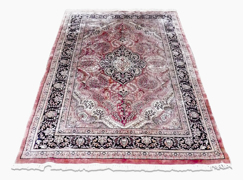 TAPPETO PERSIANO IN SETA fondo rosa, campo con volute e motivi vegetali nei toni del verde accqua e nero cm 230x150 PERSIAN SILK RUG