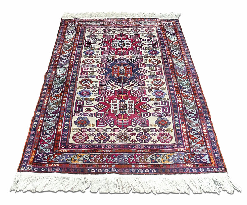 TAPPETO CAUCASICO fondo beige, campo con tre medaglioini e disegni geometrici nei toni del bordeaux, blu e celeste, difetti cm 196x134 CAUCASIAN RUG