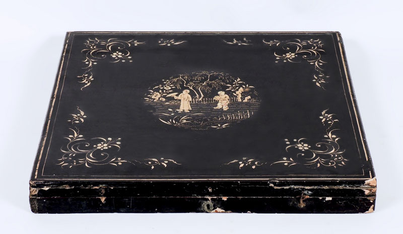 GRANDE SCATOLA QUADRATA IN LEGNO LACCATO Cina, fine del XIX secolo dipinta in oro con scena di genere entro riserva circolare e con motivi vegetali agli angoli su fondo nero, lievi difetti cm 47x47x5 LACQUERED SQUARE BOX, CINA, FINE DEL XIX SECOLO