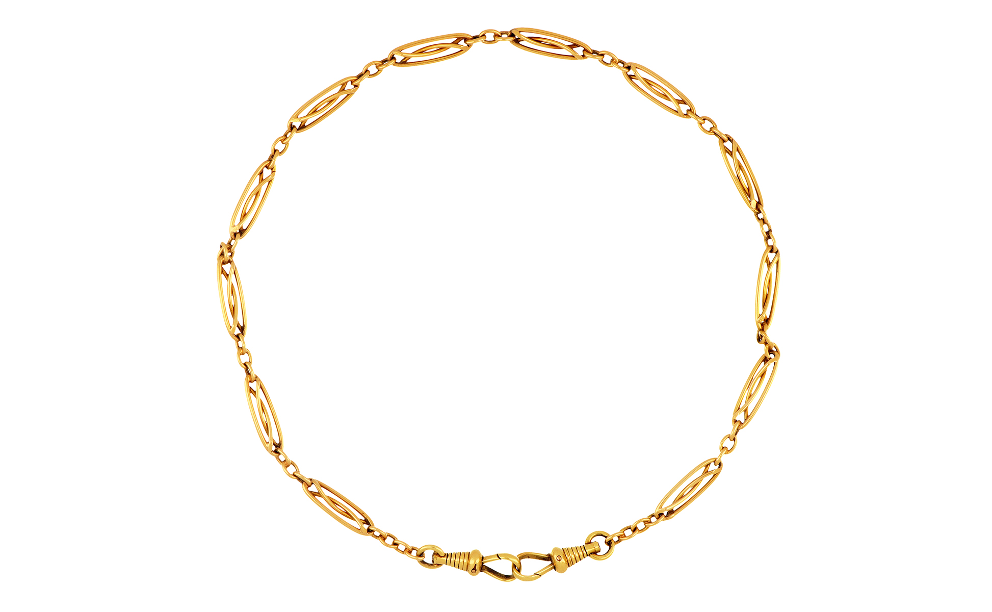 Catena da orologio in oro giallo settori ovali di filo incrociato si rincorrono tra i moschettoni.
