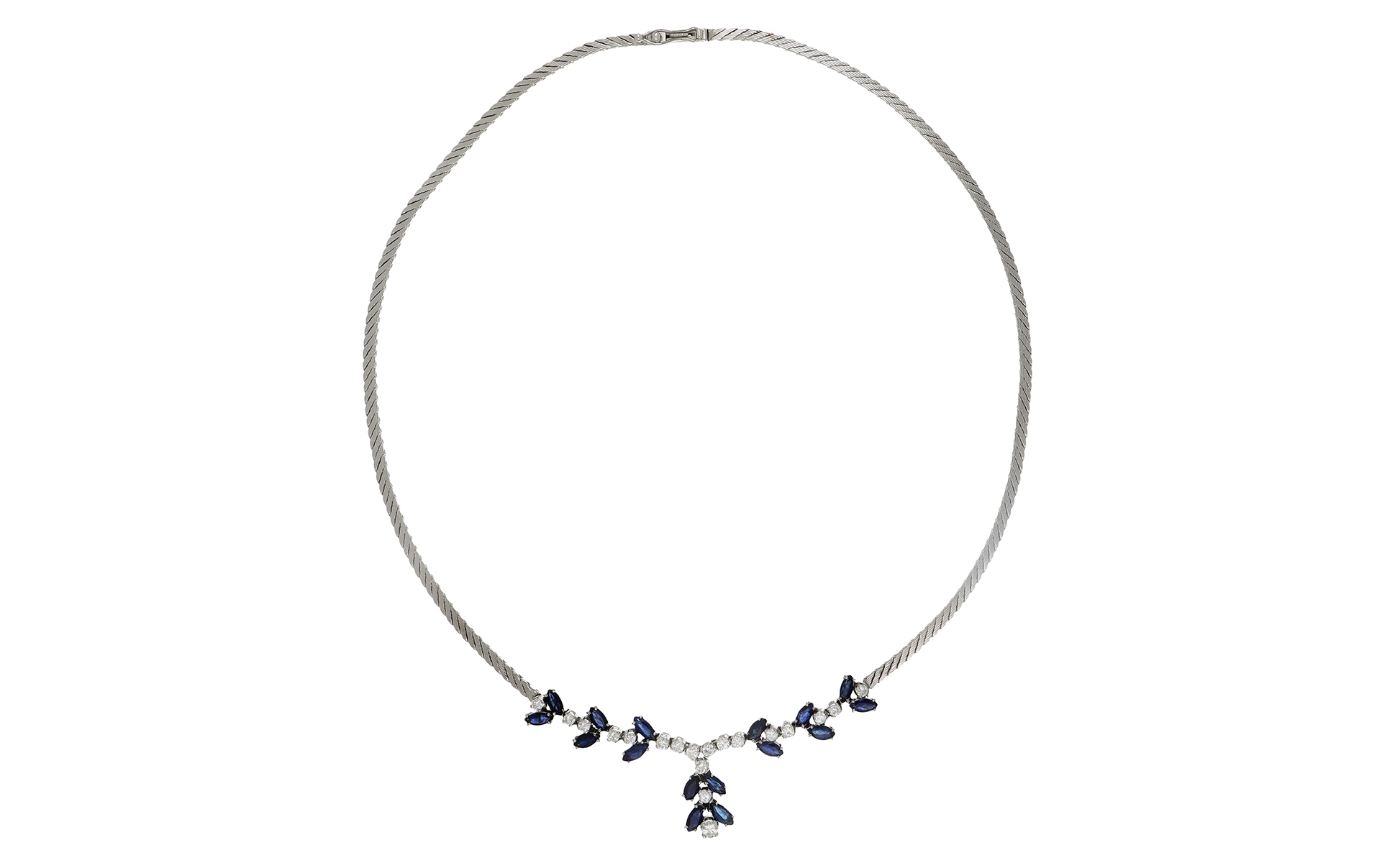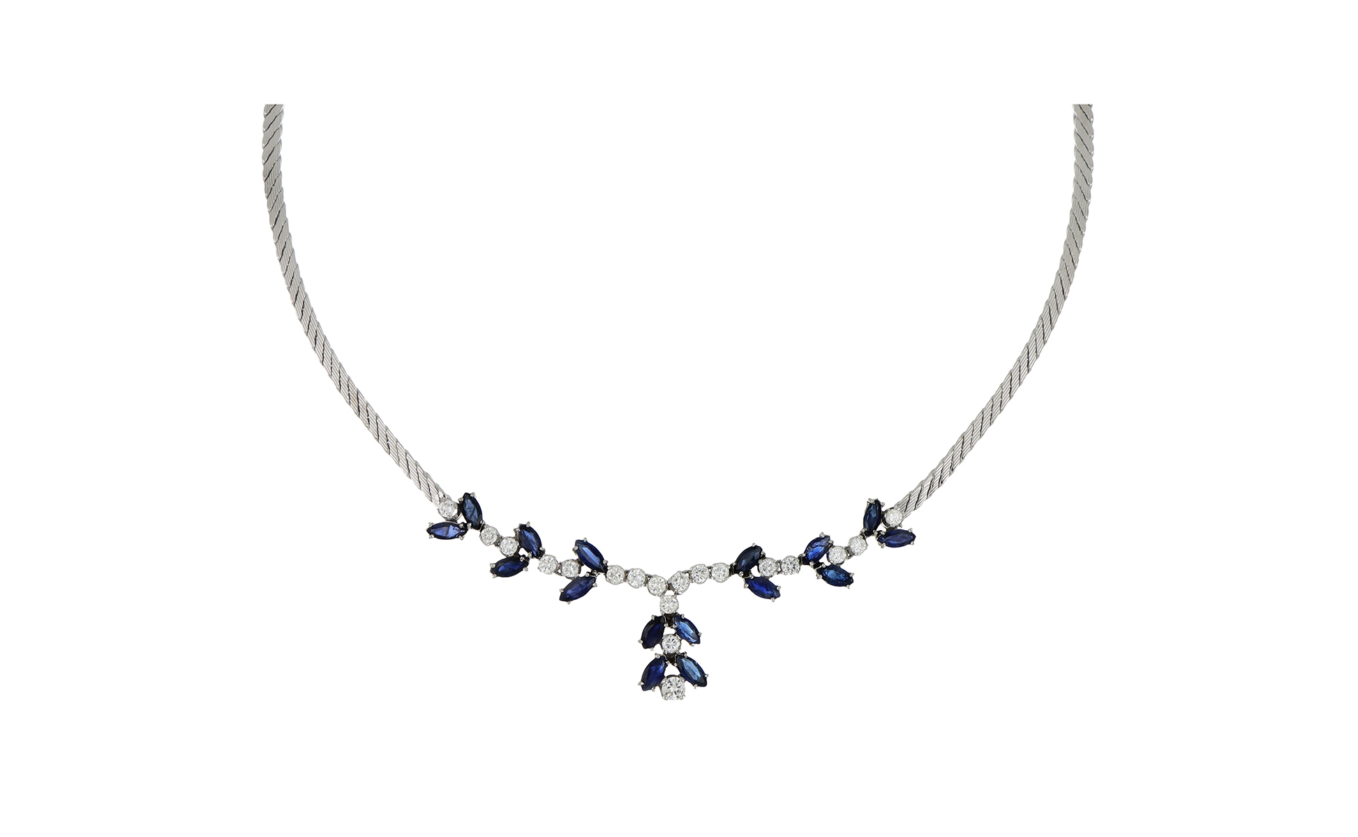 Girocollo in oro bianco a cordoncino forzato e satinato al centro motivo prezioso con diamanti taglio brillante per ct. 0 90 ca. e zaffiri taglio navette per ct. 3 40 ca.