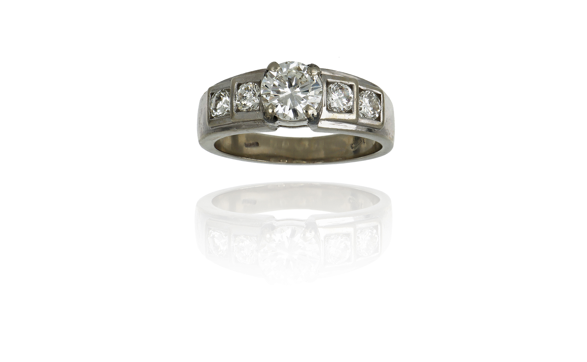 Anello in oro bianco al centro un diamante taglio brillante di ct. 1 05 ca. colore H/J purezza vvs/vs fluorescenza da media a forte 6 66 x 6 59 x 3 82 mm. sul gambo 4 altri per ct. 0 40 ca.