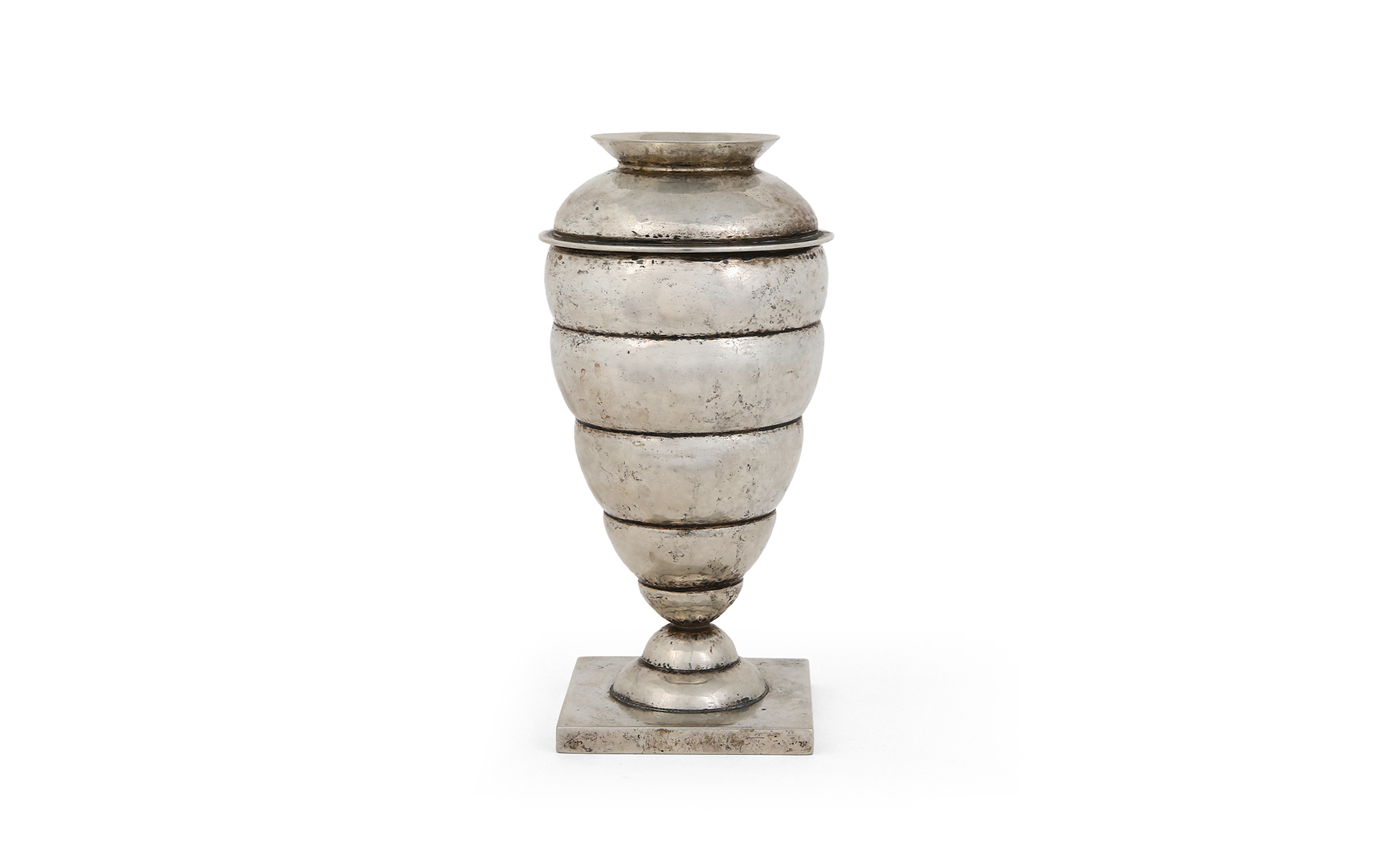 MARIO BUCCELLATI - Vaso da fiori in argento 800 lavorazione della superficie leggermente martellata fasce bombate sui perimetri incisione sul fondo dell'argentiere italiano.