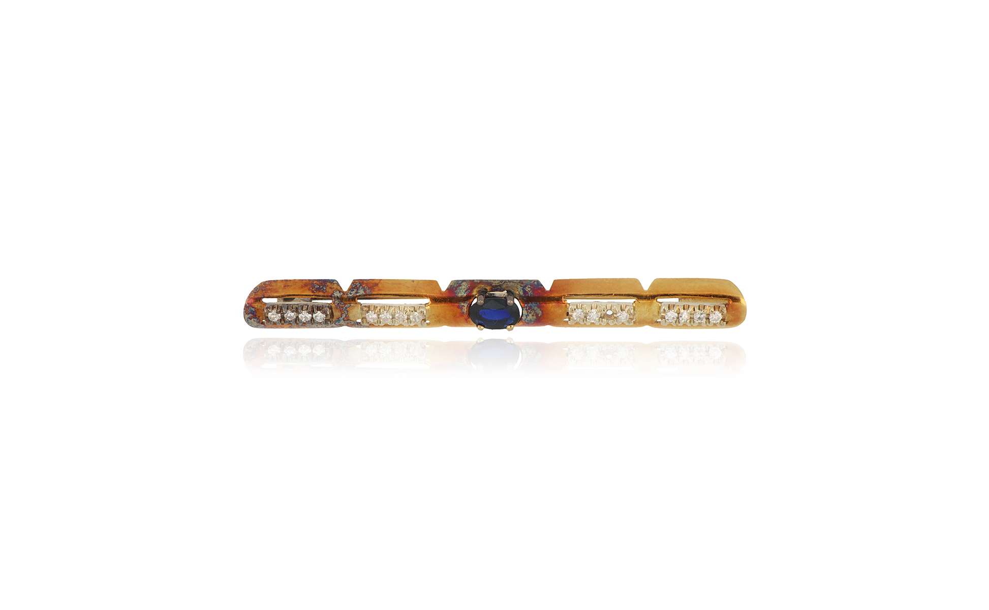 Spilla a barretta in oro giallo al centro uno zaffiro blu taglio ovale ct. 0 60 ca. piccoli diamanti taglio 8/8 lungo il fusto.