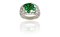 Anello a fascia bombata realizzato in oro bianco interamente ricoperto di diamanti taglio brillante per ct. 3 50 ca. nella parte superiore è caratterizzato da un rombo disegnato con smeraldi taglio rotondo per ct. 1 60 ca. due mancanti.