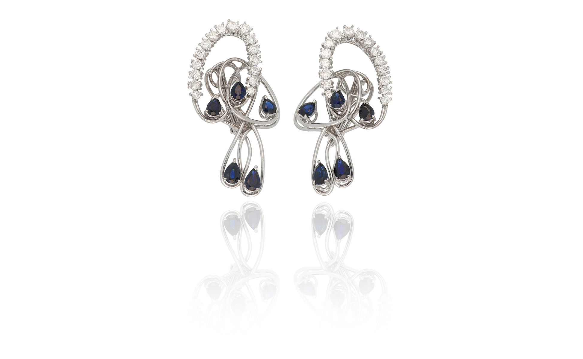 Superlegeri orecchini in oro bianco a filo il disegno a volute è decorato con piccoli diamanti taglio brillante per ct. 1 20 ca. e zaffiri taglio goccia.