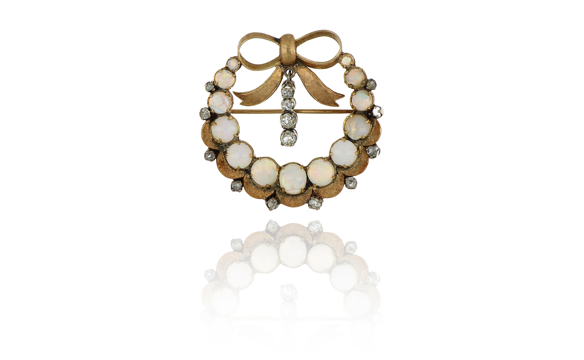 Demi parure composta da orecchini a monachella in oro con opali e diamanti di taglio vecchio e spilla a mezza luna con opali a scalare e diamanti.