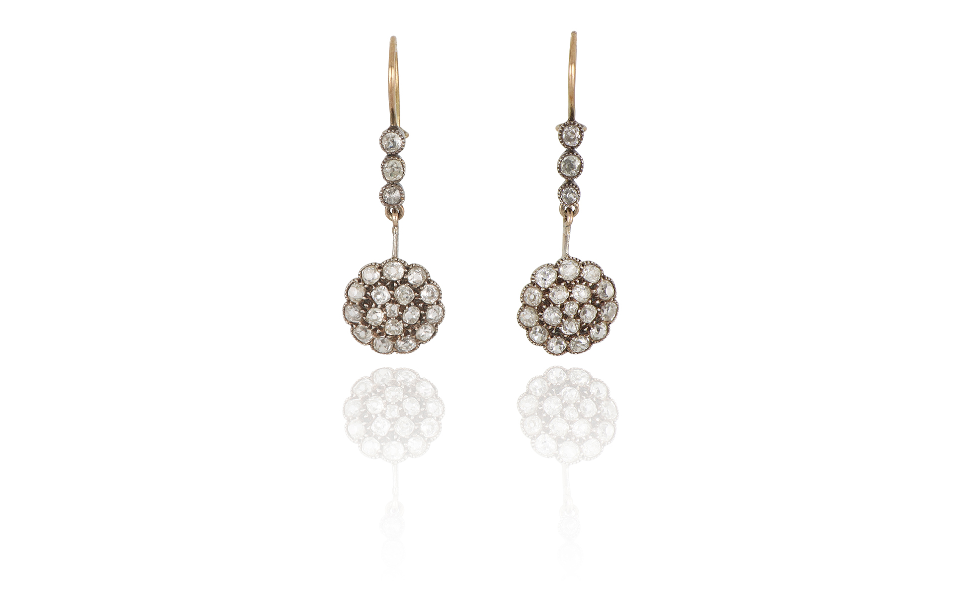 Fini orecchini pendenti in oro con chiusura a monachella primi 900 con diamanti taglio antico per stimati 1 40 ct.