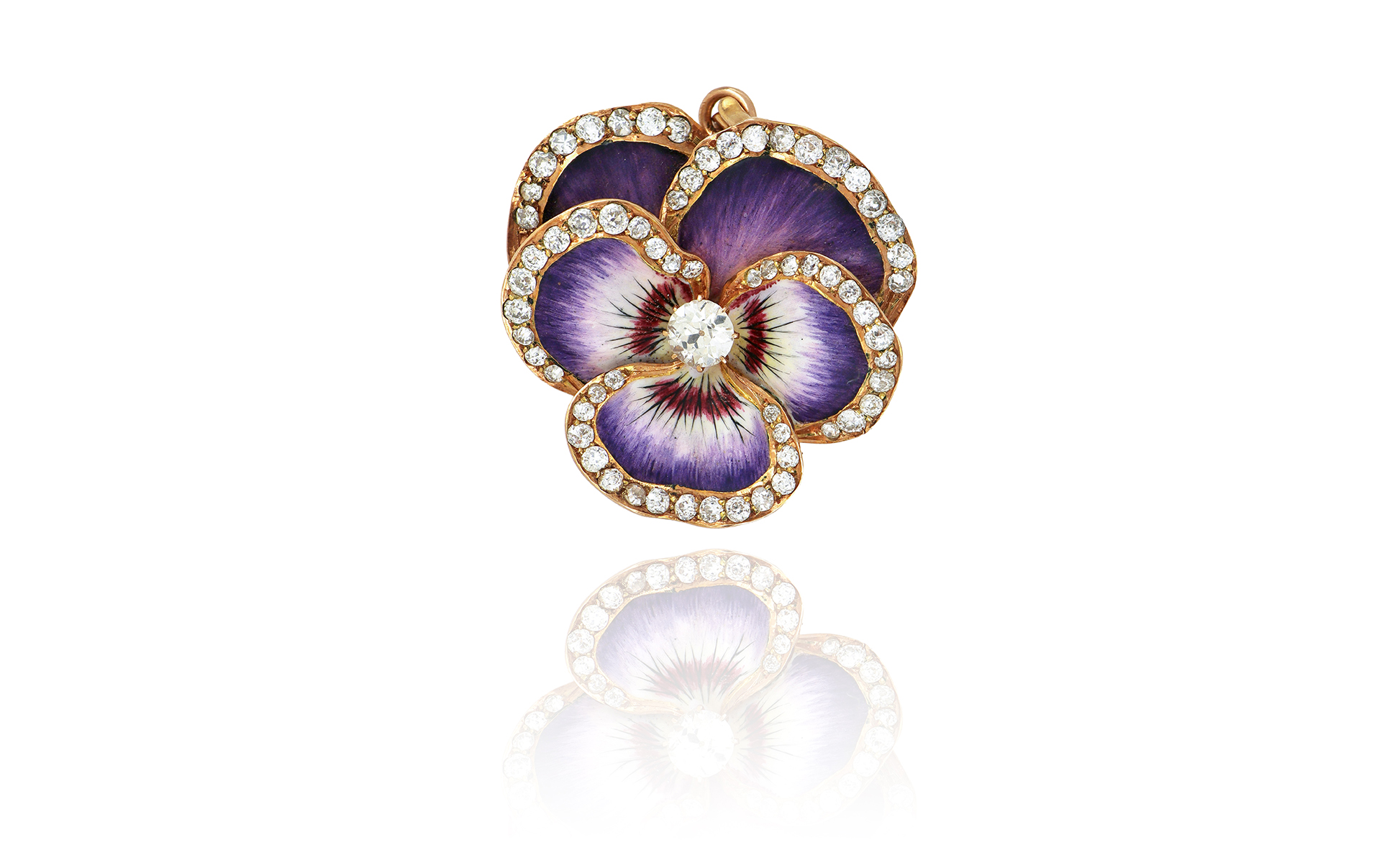 Spilla e pendente di finissima fattura in oro rosso a guisa di fiore di violetta smalti policromi contorno in diamanti di taglio vecchio.