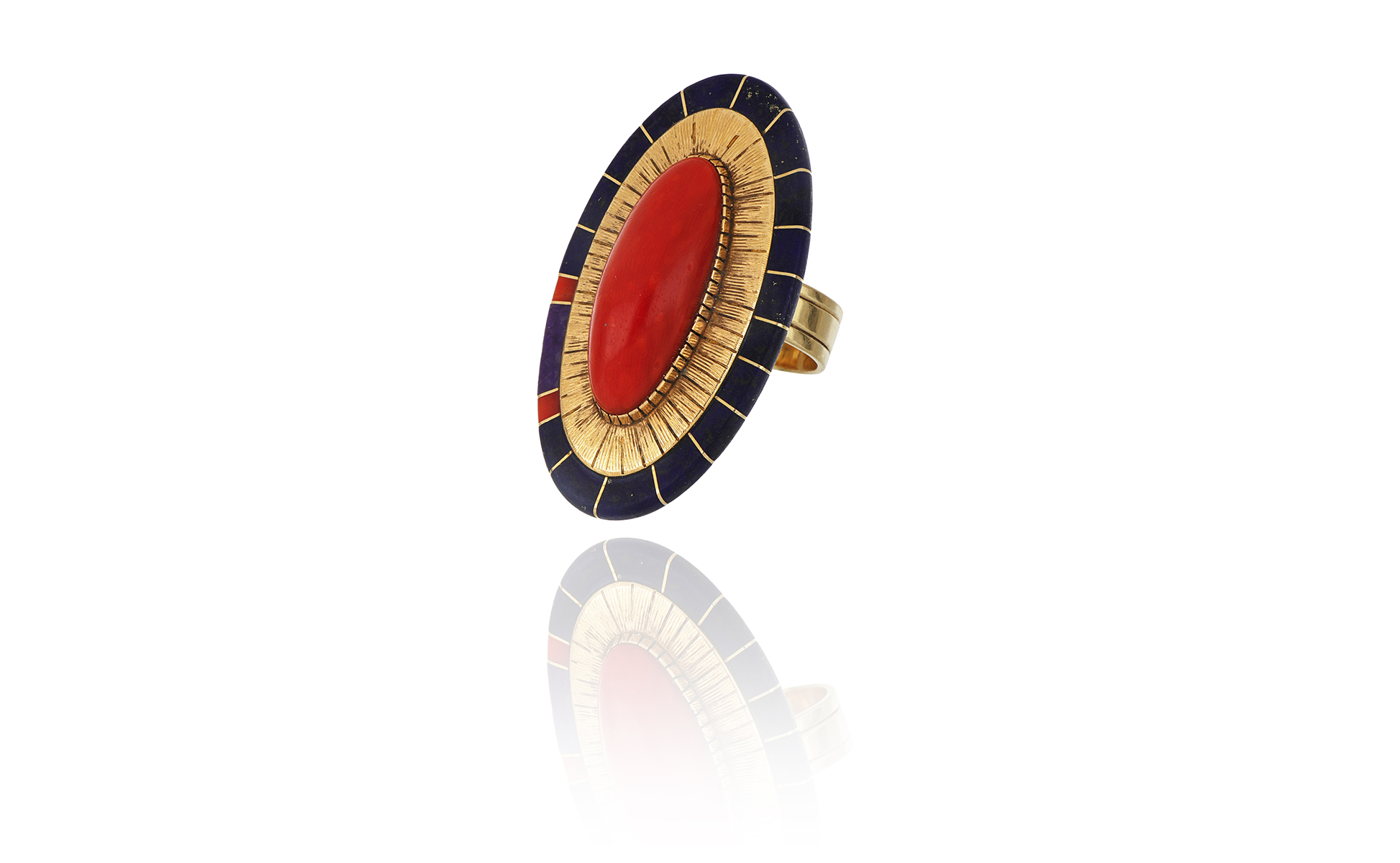 LAURI HAKOLA, grande anello etnico in oro 14 k, con cabochon di corallo centrale e contorno a raggiera di lapislazzuli.