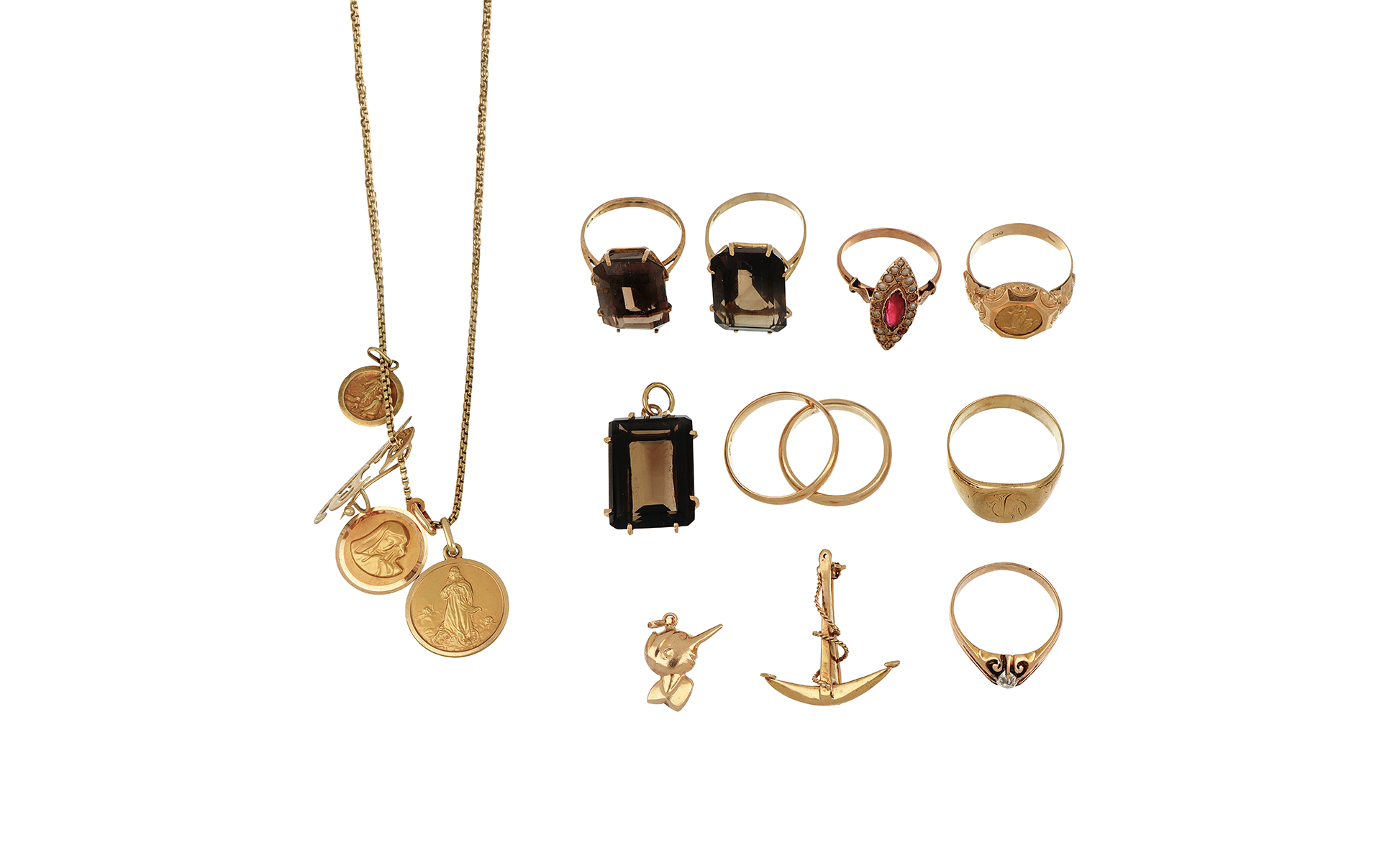 Lotto composto da 8 anelli 2 spille 2 ciondoli una catenina con 3 medagliette il tutto in oro 18k.