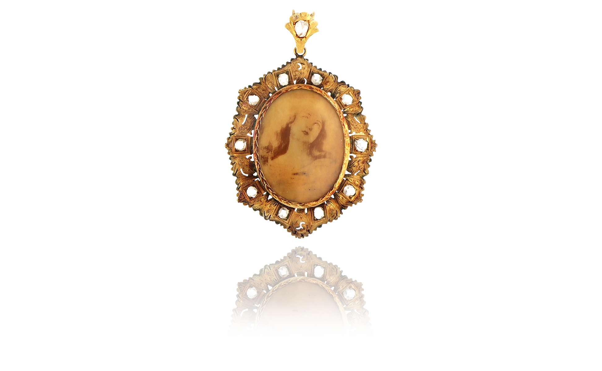 Antico porta miniatura / fotografia in oro rosso di fine '800 con diamanti taglio a rosa a contorno incisione sul retro monogramma inciso.