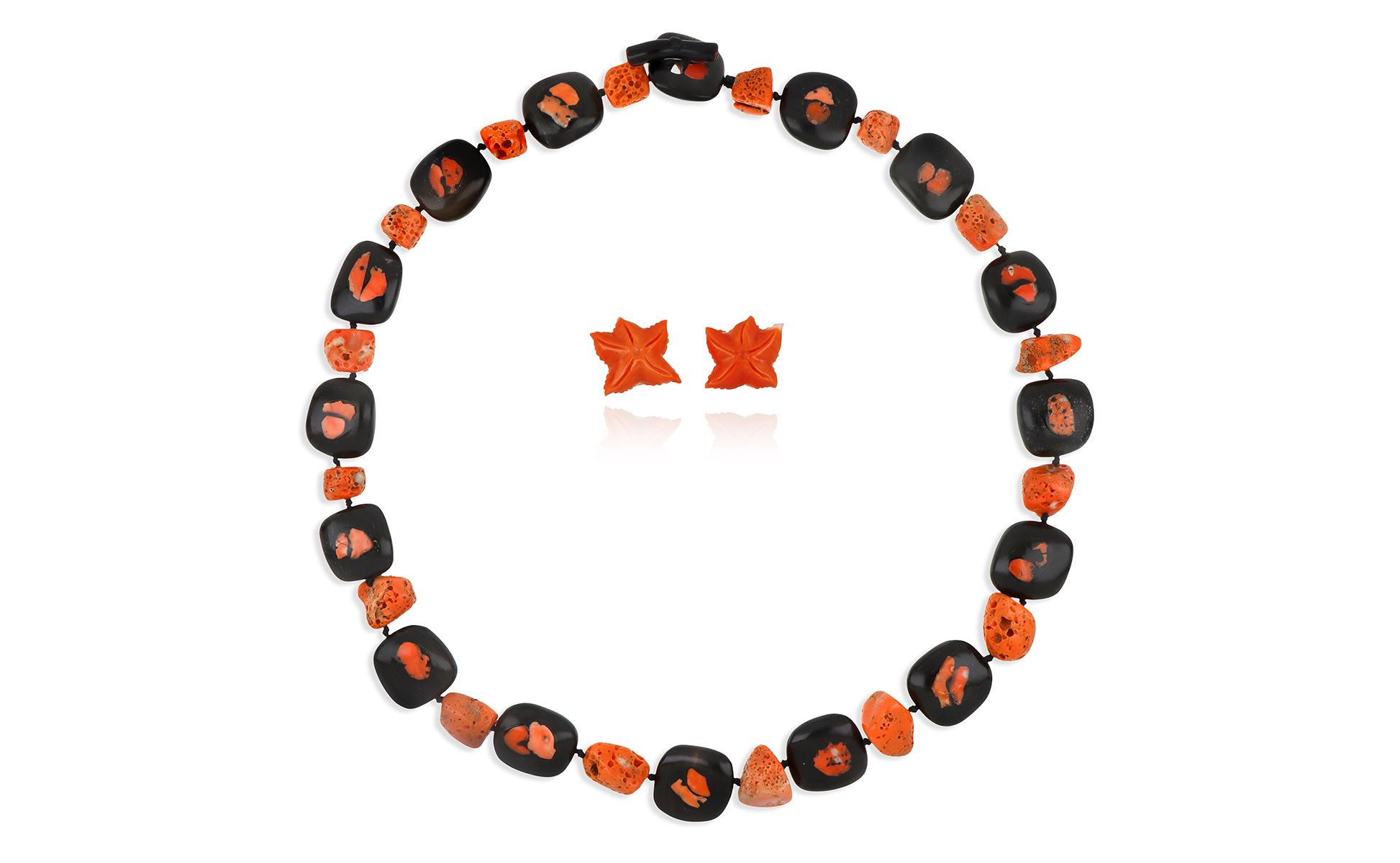 Collana sarda in corallo e corno orecchini in corallo a guisa di stella marina con clips in oro giallo.