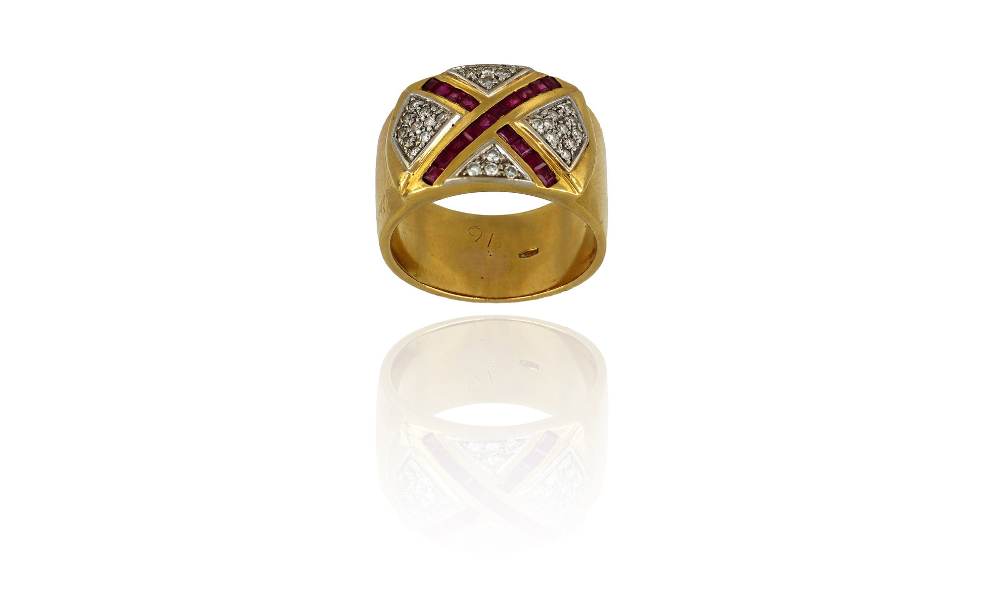 Anello a fascia in oro giallo con croce di carrè di rubini e pavè di diamanti.