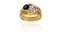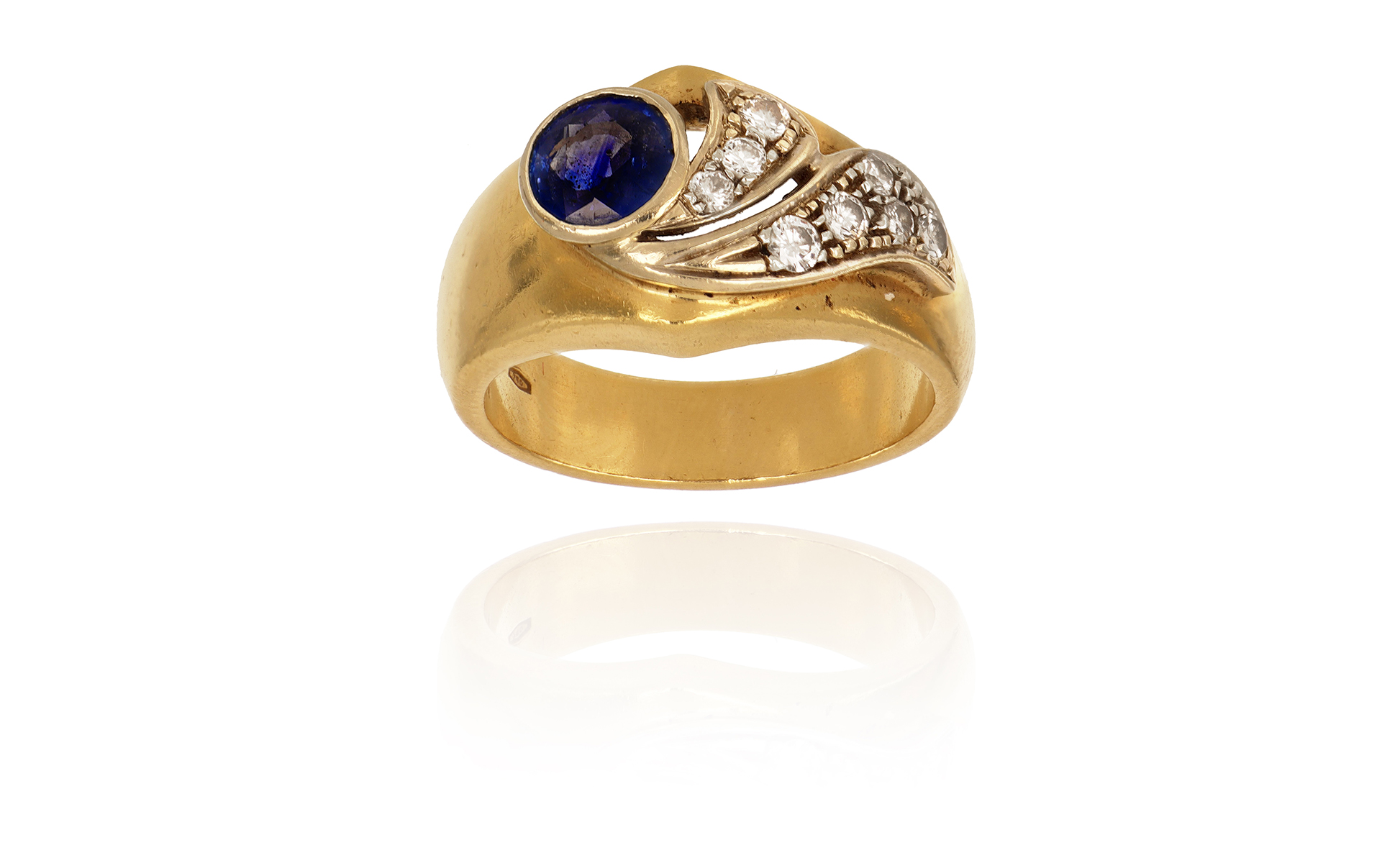 Anello a fascetta in oro giallo e bianco al centro zaffiro taglio tondo di ct. 1 00 ca. e piccoli diamanti taglio brillante sul decoro.