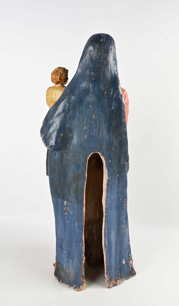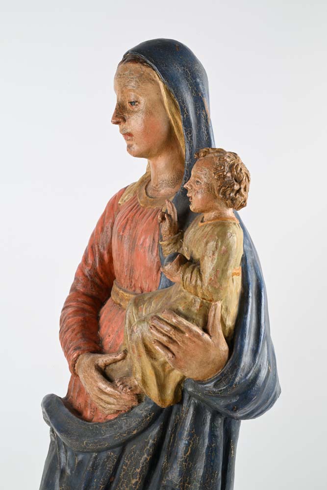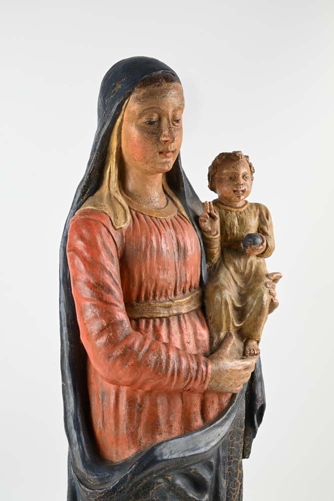 Madonna col Bambino benedicente, Toscana, XVI secolo Gruppo scultoreo caratterizzato da un'accesa policromia; la resa frontale della Vergine, la cura dei panneggi, la posa arcaizzante del Bambino in piedi in abiti sacerdotali con gesto benedicente, esprimono dolcezza e intimità, tipiche dell’arte rinascimentale. I volti sono sereni, con tratti delicati e naturali, l’abbigliamento è ricco di pieghe morbide che evidenziano la maestria dello scultore. La composizione riflette un equilibrio armonico, simbolo della sacralità e della tenerezza materna. terracotta policroma altezza cm 96
