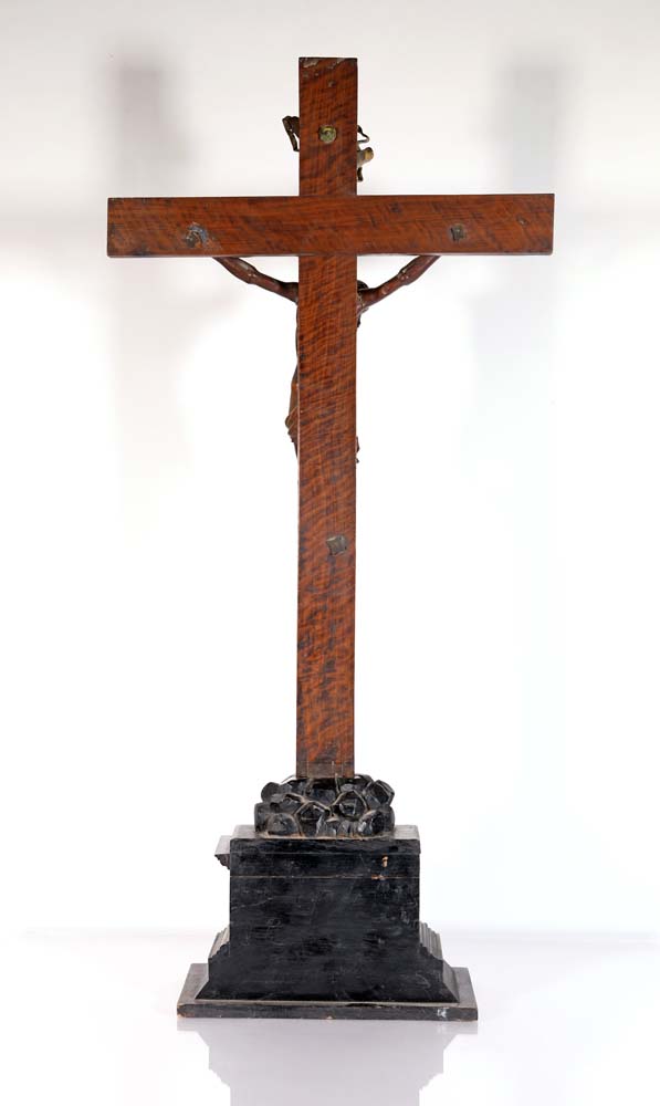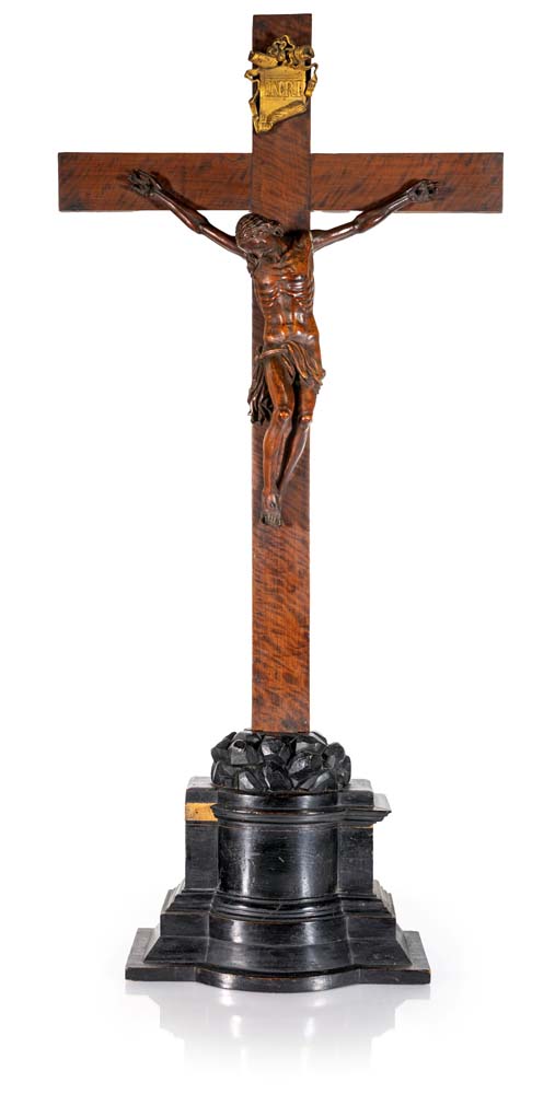 Crocifisso da altare in bosso, primo quarto del XVIII secolo La raffigurazione di Cristo morto in croce con le gambe piegate mostra il corpo ormai privo di vita, ancora inchiodato al legno. Il capo è reclinato sul petto, gli occhi chiusi, e il volto sereno ma segnato dal dolore. Le gambe leggermente piegate accentuano il peso del corpo che pende dalla croce, sottolineando la sofferenza fisica del sacrificio. L’assenza della ferita laterale suggerisce un momento immediatamente successivo alla morte, prima dell’intervento dei soldati, oppure una scelta simbolica dell’artista, che mette in risalto l’umanità e la dignità del Cristo anche nella morte. Titulus crucis in bronzo dorato in forma di cartiglio dai margini ricurvi; base in legno ebanizzato cm 86x26,5x15 - Cristo cm 27x28