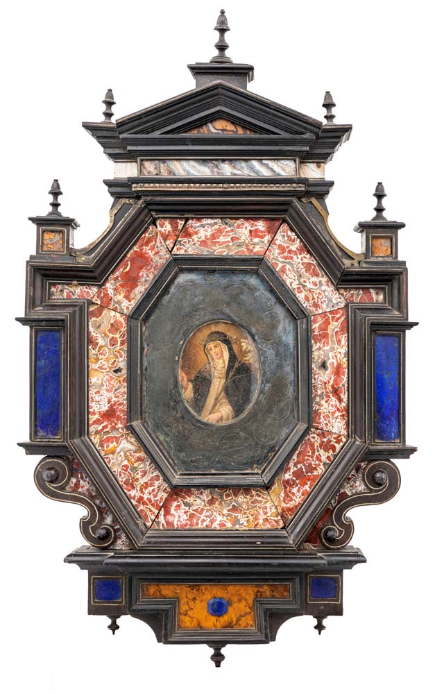 Altarolo in legno ebanizzato, diaspri e marmi policromi, Stato Pontificio, XVII secolo Questa raffinata cornice può essere accostata a un insieme di opere analogamente lavorate, attribuite ad artigiani romani e fiorentini del Seicento. Queste cornici, spesso destinate a un uso devozionale, erano comunemente pensate per accogliere al centro un dipinto, come nel nostro caso una miniatura ovale raffigurante Santa Caterina da Siena cm 39x24