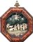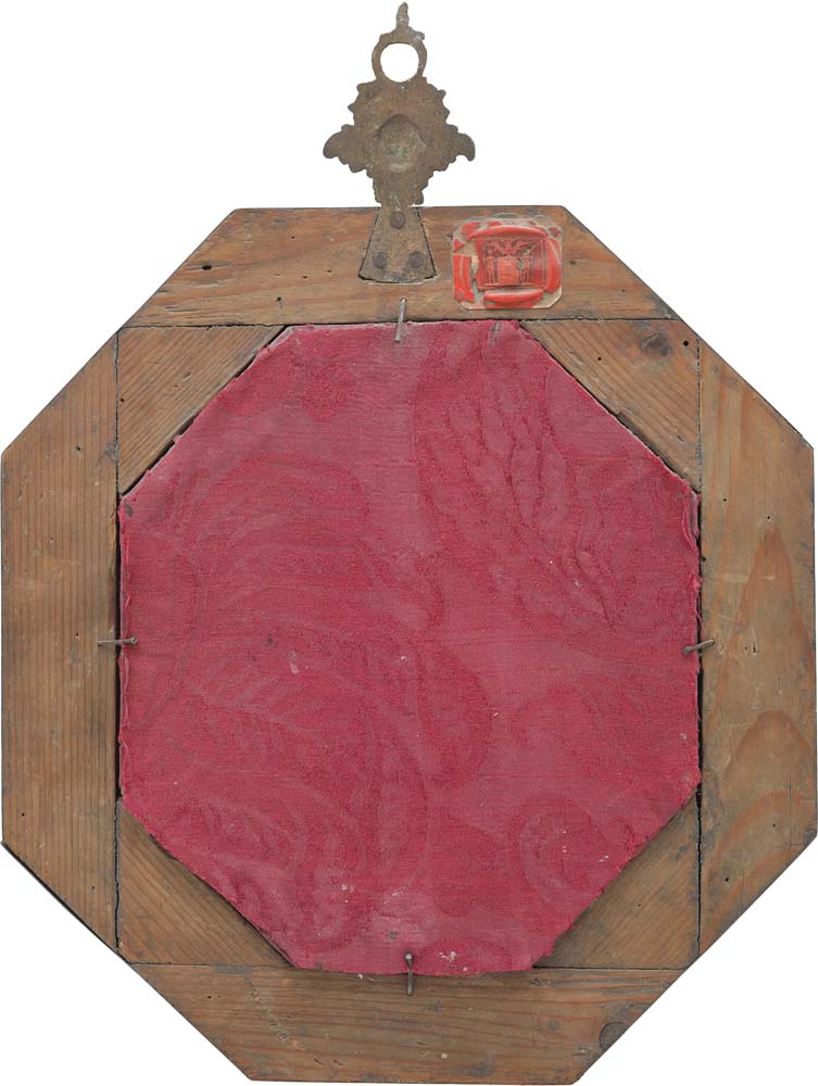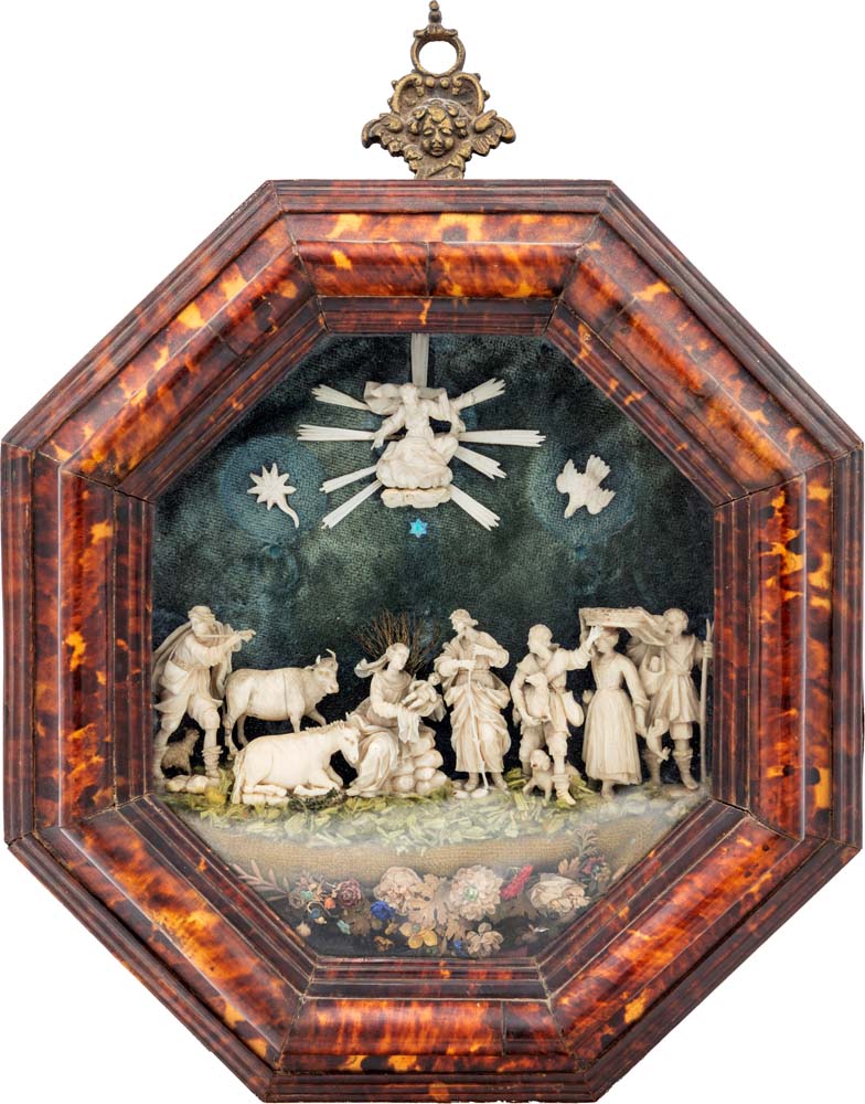 Adorazione di pastori La composizione si sviluppa su più livelli, creando un senso di profondità e movimento che accresce il realismo della rappresentazione; la scena si compone di numerose figure ambientate su zolla erbosa costituita da muschio ed è dominata dalla figura di Dio Padre su cumulo di nubi con le braccia aperte in un gesto di benedizione, dal quale si irradiano raggi di luce che simboleggiano la gloria divina; ai lati la cometa e la colomba quale simbolo dello Spirito Santo; in basso, al centro, la Sacra Famiglia. La Vergine è ritratta seduta col Bambino Gesù in braccio; alla sua sinistra San Giuseppe in atteggiamento raccolto e devoto e tre figure di contadino con animali e doni; alla destra di Maria l'asinello accovacciato, il bue in secondo piano ed un giovane pastore ritratto mentre suona il flauto. Cornice ottagonale lastronata in tartaruga con fascia convessa; sulla sommità attaccaglia in bronzo con testa di cherubino; al verso, lungo il profilo superiore del telaio, bollo di ceralacca con insegna araldica.