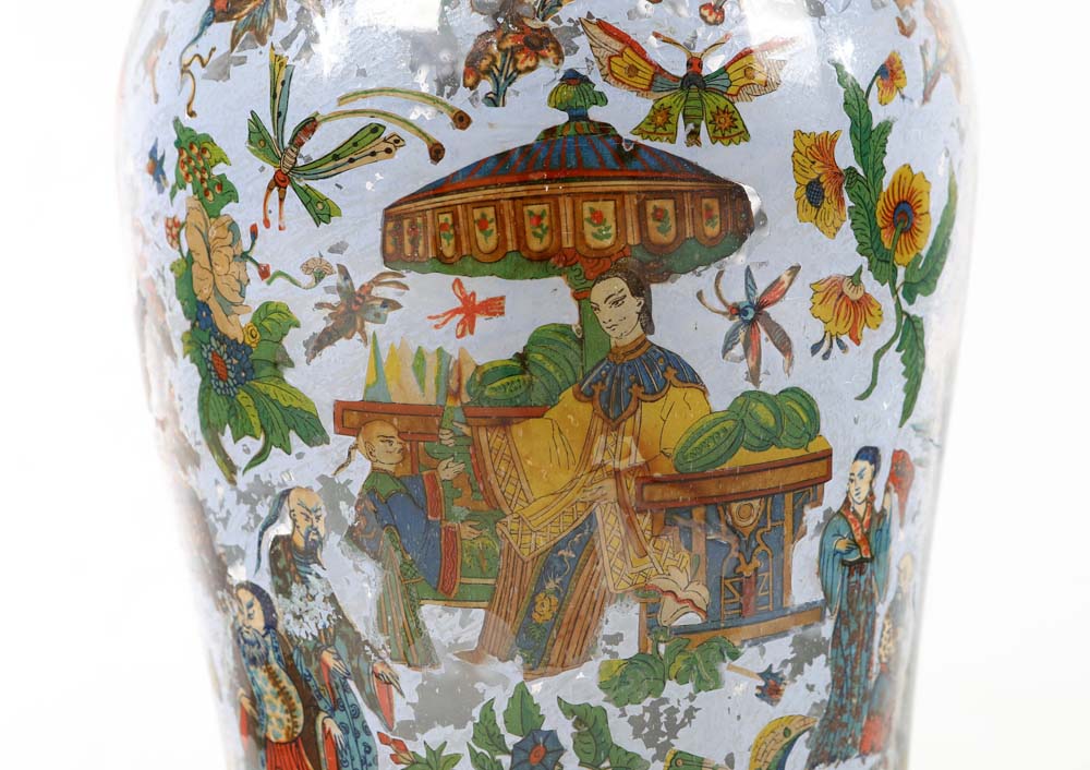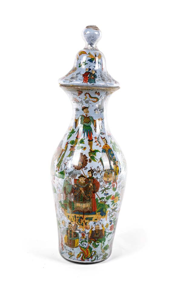 Vaso in vetro con coperchio decorato ad arte povera, Piemonte, XVIII secolo decorato in vivace policromia con figure orientali, volatili, farfalle e vegetazione orientale su fondo celeste. Difetti alla decorazione altezza cm 66