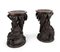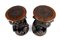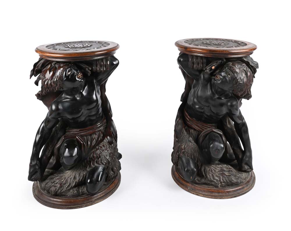 Coppia di sgabelli figurati in legno scolpito ed ebanizzato, Venezia, metà del XIX secolo concepiti per essere disposti "vis à vis", sono caratterizzati da figure di schiavo nubiano inginocchiato sotto un albero con fronde sulla cui sommità poggia un piano circolare con motivi ornamentali intagliati in bassorilievo; ogni schiavo reca occhi dipinti ed indossa una pelle di leone/lupo quale simbolo di protezione e di lealtà. Piani non pertinenti