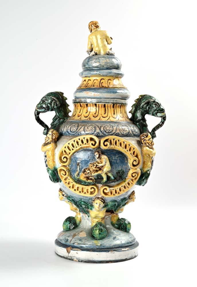 Vaso in maiolica policroma con coperchio, Napoli, XIX secolo corpo a balaustro caratterizzato da due grandi cartigli a rilievo raffiguranti ognuno un episodio delle fatiche di Ercole: la cattura del toro di Creta e l’uccisione del leone di Nemea; ai lati due figure di tritone sostengono uno scudo araldico quadripartito su cui poggiano anse a forma di animale fantastico con lunga proboscide; corpo sorretto da figure di arpia su piede circolare; coperchio a cupolino sormontato da un putto con cartiglio; difetti e restauri