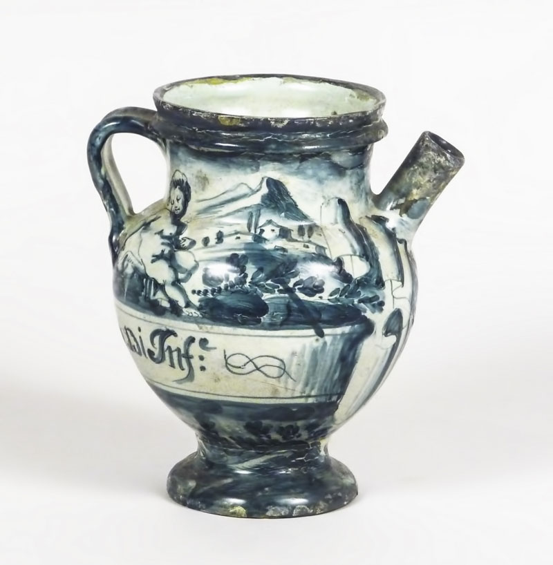 VERSATOIO DA FARMACIA Genova, XVIII secolo dipinto con putti entro paesaggi inmonocromia blu, centrato da cartiglio "Sir: di violetta di Inf:", difetti h cm 22 Reca simbolo grafico della lanterna in sottosmalto blu MAIOLICA JAR, GENOA, 18TH CENTURY