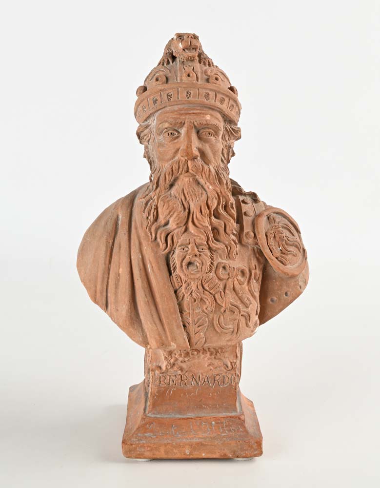 Ritratto del Conte Bernardo Piccolo busto in terracotta raffigurante un uomo con lunghi capelli sciolti sulla nuca e folta barba ricadente sulla corazza modellata in rilievo con mascheroni e nastri annodati; in testa elmo da parata a calotta con paranuca idealmente trattenuto da corona ferrea, decorato da rilievi vegetali e sormontato da cimiero zoomorfo; piedistallo squadrato con iscrizione frontale "Bernardo"; ai lati scudi per accogliere stemmi araldici, sormontati da corona radiata a sette punte. Al verso firma e data incussa in pasta: "Pinto Desiderio fece Pesaro 1874". Mancante un angolo posteriore del piedistallo.