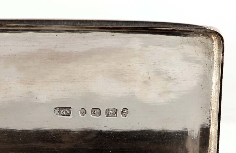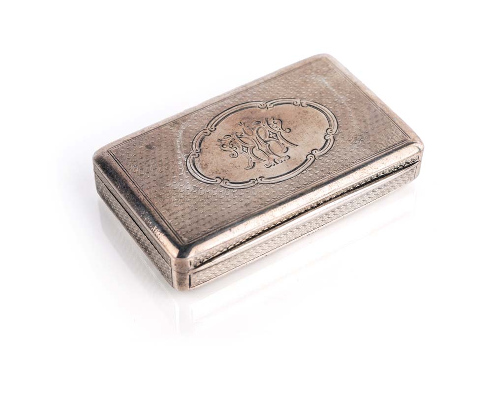 Tabacchiera in argento, Birmingham, Regina Vittoria, seconda metà del XIX secolo forma rettangolare con coperchio incernierato centrato da riserva con monogramma inciso su fondo guillochées. Datario non leggibile cm 1x7,5x4,5 - gr. 70