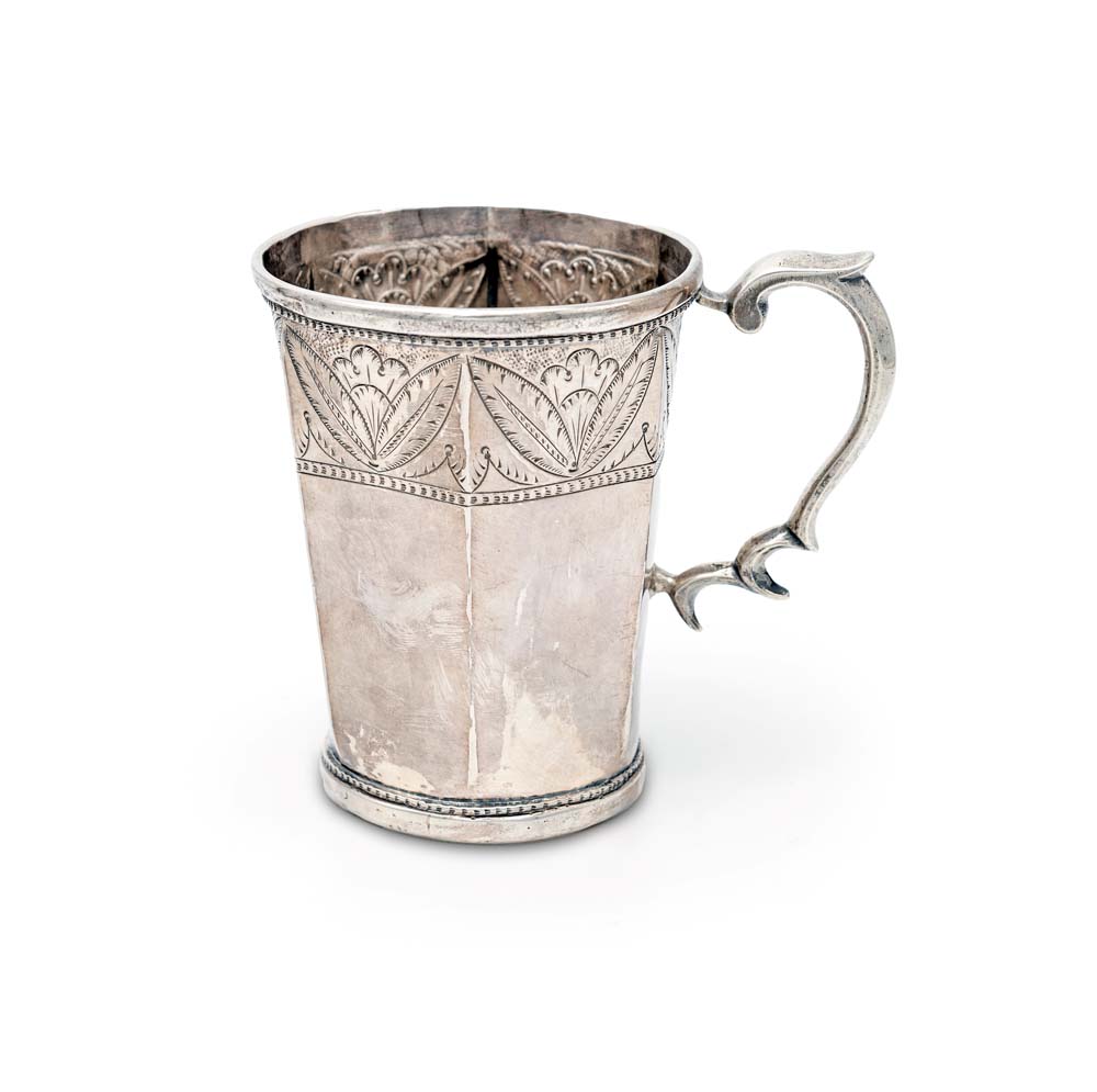 Bicchiere in argento con manico, Sud America, fine XIX/inizi XX secolo corpo esagonale decorato nella parte superiore da una fascia con motivi vegetali incisi; manico sagomato cm 11x12,5x8,7 - gr. 316
