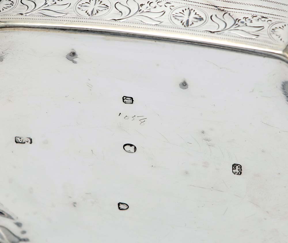 Teiera in argento, Londra, 1792 corpo ottagonale con profili percorsi da decorazioni minima incisa; composizioni di fiori racchiusi da un cartiglio ornano le facciate; versatoio cilindrico, coperchio a scomparsa incernierato, manico in legno cm 16x27x9,5 - gr. 496 lordi