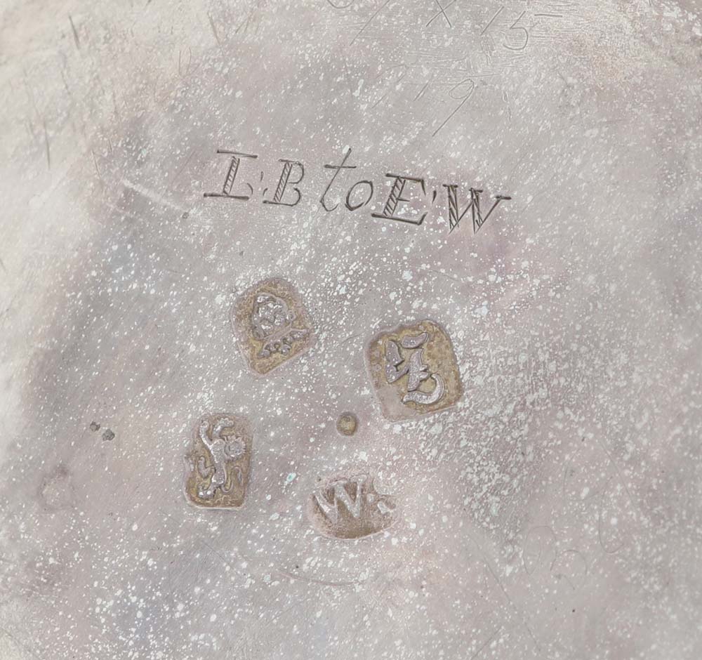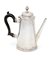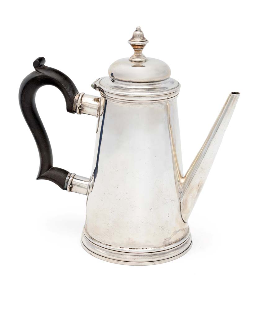 Antica caffettiera in argento, Londra 1766 (?) corpo a tronco di cono liscio su basso piede modanato, lungo versatoio cilindrico, coperchio a cupolino incernierato con presa a trottola, manico sagomato in legno ebanizzato. Sul fondo iniziali incise "I.B. to E.W." altezza cm 19 - peso lordo gr. 482
