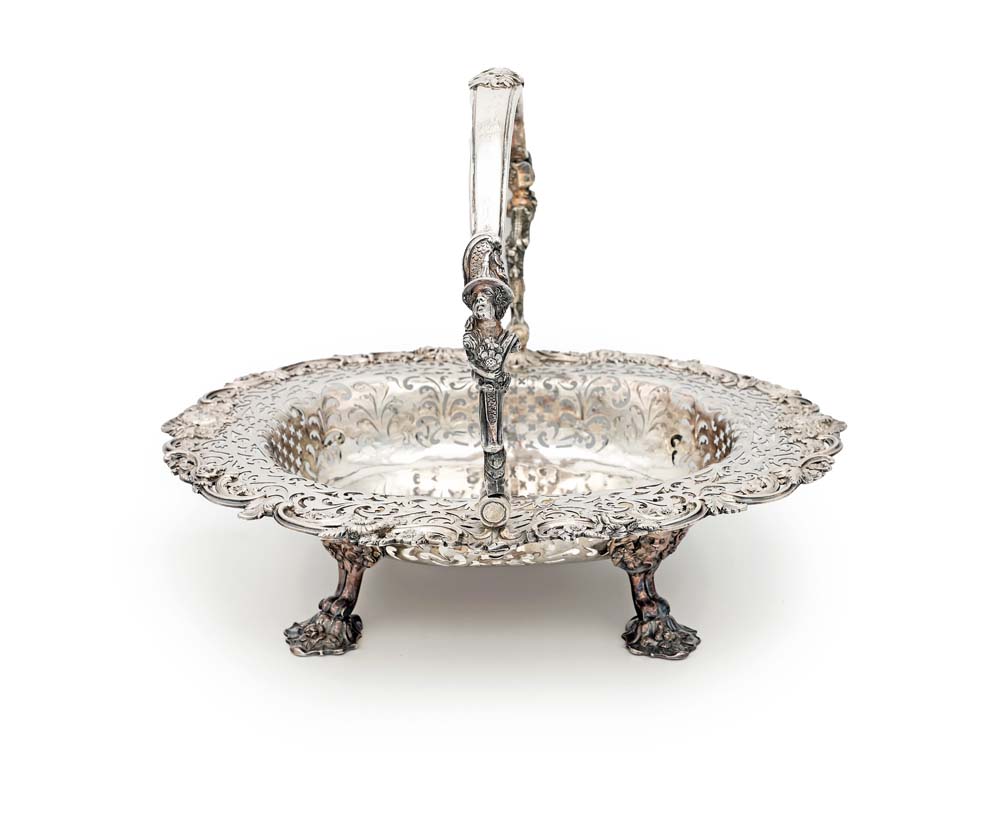 Grande cestino in argento, Londra 1752, orafo Edward Aldridge di forma ovale con ampia tesa traforata racchiusa da volute in sequenza arricchite da tralci vegetali e composizioni di fiori culminanti ai vertici con volti femminili; analogo elemento decorativo è ripreso all'attaccatura dei piedi; manico dominato da un cartiglio applicato, sorretto da figure scultoree di cariatide con volto lievemente rivolto "au contraire"  cm 27x38x30 - gr. 1820