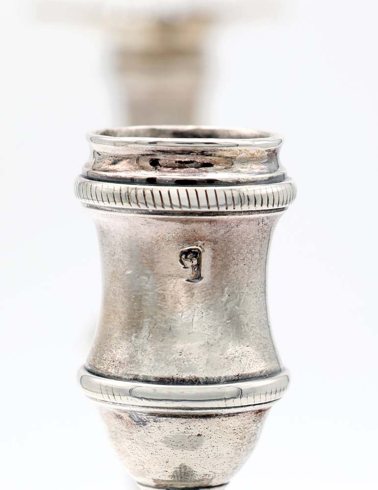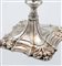 Coppia di candelieri in argento, Londra, Giorgio II, orafo William Cafe (attivo dal 1757) fusto a balaustro composito su piede quadrangolare gradinato caratterizzato da rilievi vegetali angolari