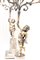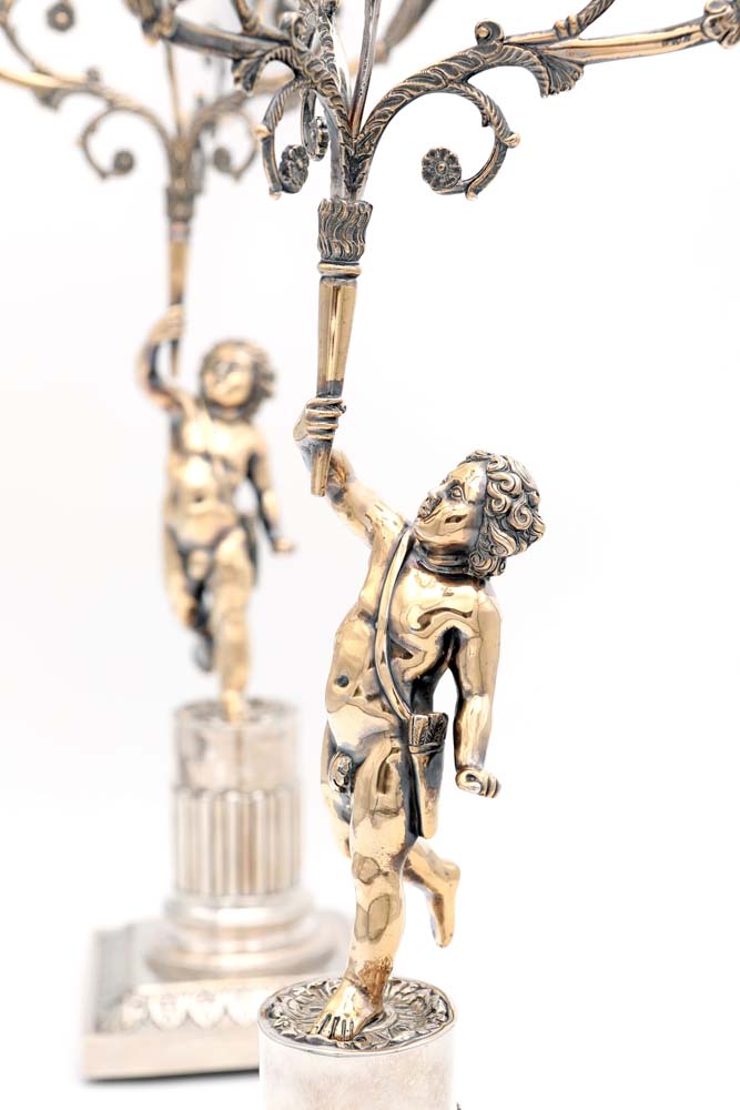 Coppia di candelabri a tre fiamme in argento e argento dorato con putti, Napoli, 1835/50 figure scultoree di amorino ritratto con fiaccola in mano sulla cui sommità si imperniano tre bracci reggicandela ed al centro una melagrana; sostegno a rocchio di colonna su base quadrilobata con profilo a palmette altezza cm 48 - appesantiti