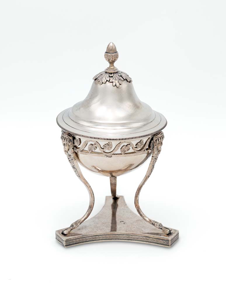 Zuccheriera in argento con coperchio, Lombardo Veneto, XIX secolo corpo semisferico con alloggio costituito da una fascia traforata decorata da una linea ondulata con foglie incise, sorretta da tre figure di cariatide terminanti a zoccolo; coperchio a cupolino dominato da una ghianda; base trilobata. Difetti e restauri cm 20x10,5 - gr. 408