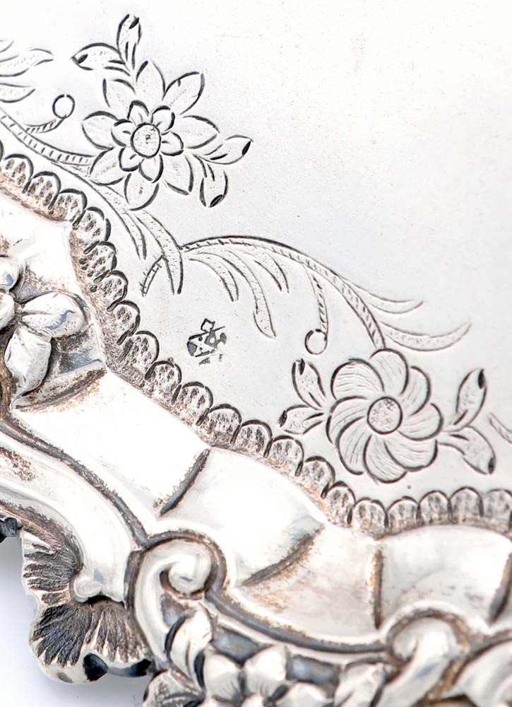Piccolo salver in argento, Olanda, XIX secolo al centro iniziali circondate da tralci con fiori incisi che incorniciano il piatto; tesa sagomata decorata da valve e composizioni di fiori; piedi in forma di cartiglio cm 3,5x20 - gr. 272