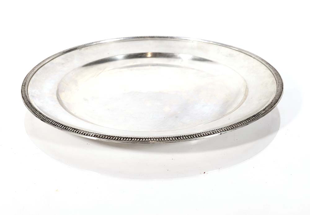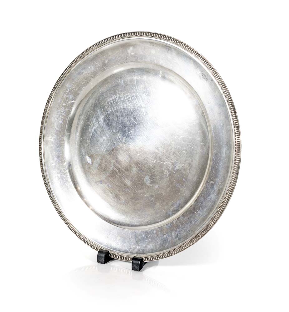 Grande piatto circolare in argento 800/000 orlo percorso da dentelli delimitati da perline gr. 1240 diametro cm 40