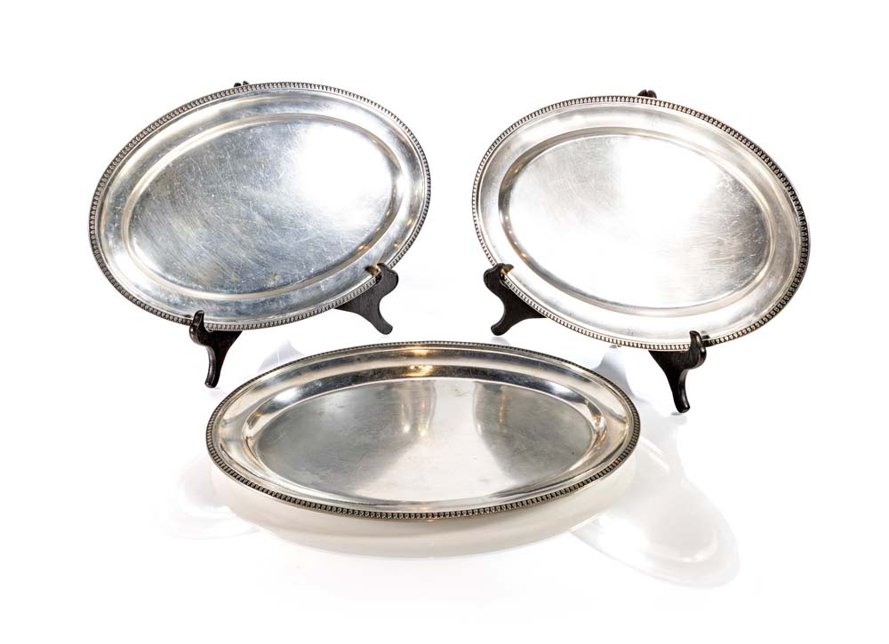 Tre vassoi da portata ovali ed una pescera in argento 800/000, Frugoni, Roma una coppia ed un terzo leggermente più grande, con profili cesellati a palmette