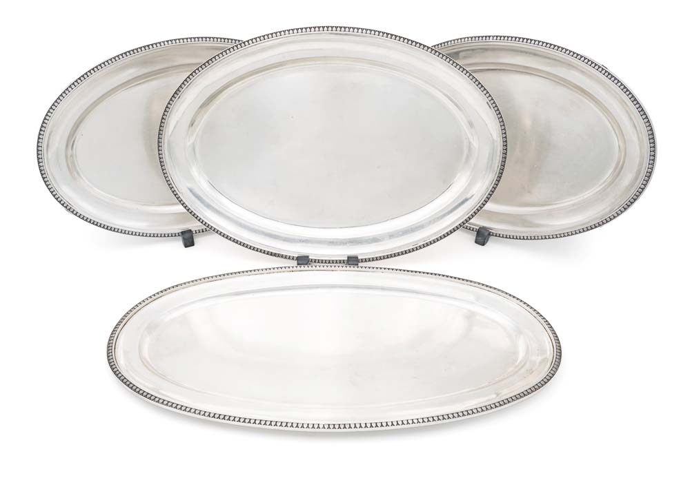 Tre vassoi da portata ovali ed una pescera in argento 800/000, Frugoni, Roma...