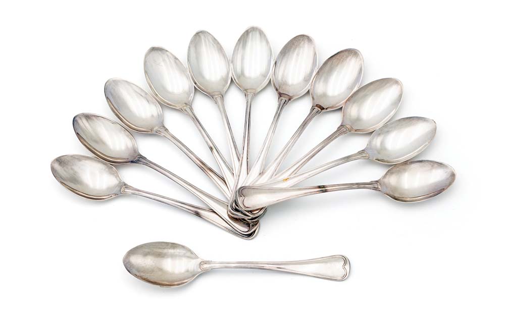Dodici cucchiai da dessert con impugnatura a cuore argento 800/000 cm 13 - peso complessivo gr. 205