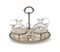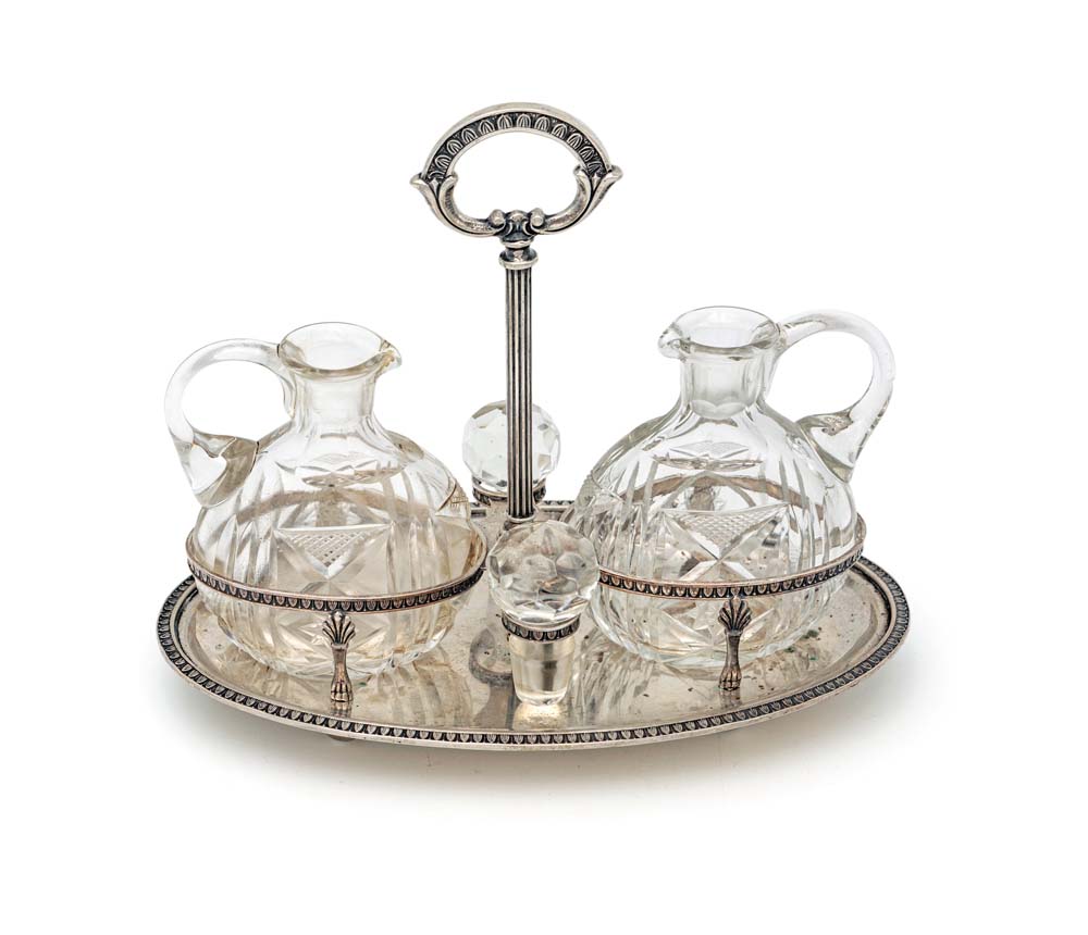 Acetoliera in argento 800/000 vassoio ovale con piedi a sfera, presa centrale e profili a palmette cm 19x22x13 - gr. 346