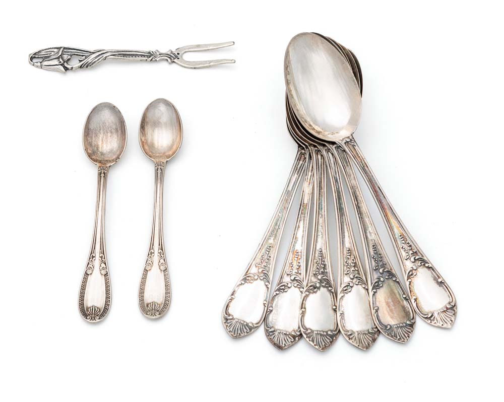 Lotto composto da sei cucchiaini da caffè e tre piccole posatine per servire sei cucchiaini da caffè con impugnatura cesellata, una coppia di piccoli cucchiaini da saliera stile Impero ed una forchettina a due rebbi con impugnatura a forma di stelo fiorito cm 10, cm 7 e cm 6,5 rispettivamente - peso complessivo gr. 60